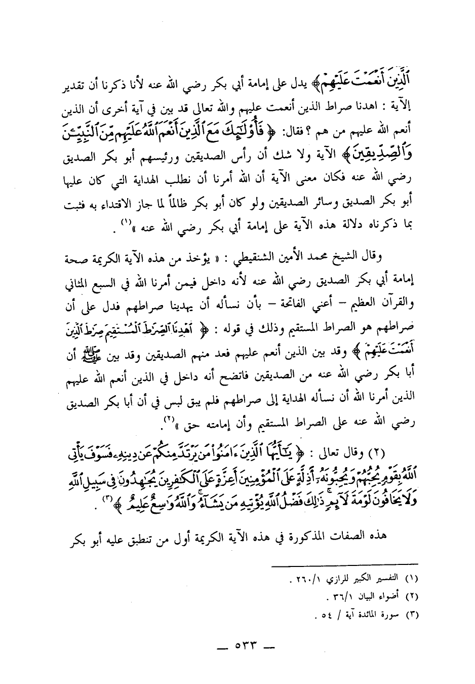 وقال الشيخ محمد الأمين الشنقيطي: "يؤخذ من هذه الآية الكريمة صحة إمامة أبي بكر الصديق رضي الله عنه لأنه داخل فيمن أمرنا الله في السبع المثاني والقرآن العظيم ـ أعني الفاتحة ـ بأن نسأله أن يهدينا صراطهم فدل على أن صراطهم هو الصراط المستقيم وذلك في قوله: {اهْدِنَا الصِّرَاطَ الْمُسْتَقِيمَ * صِرَاطَ الَّذِينَ أَنْعَمْتَ عَلَيْهِمْ} وقد بين الذين أنعم عليهم فعد منهم الصديقين وقد بين النبي صلى الله عليه وسلم أن أبا بكر رضي الله عنه من الصديقين فاتضح أنه داخل في الذين أنعم الله عليهم الذين أمرنا الله أن نسأله الهداية إلى صراطهم فلم يبق لبس في أبي بكر الصديق رضي الله عنه على الصراط المستقيم وأن إمامته حق"2.