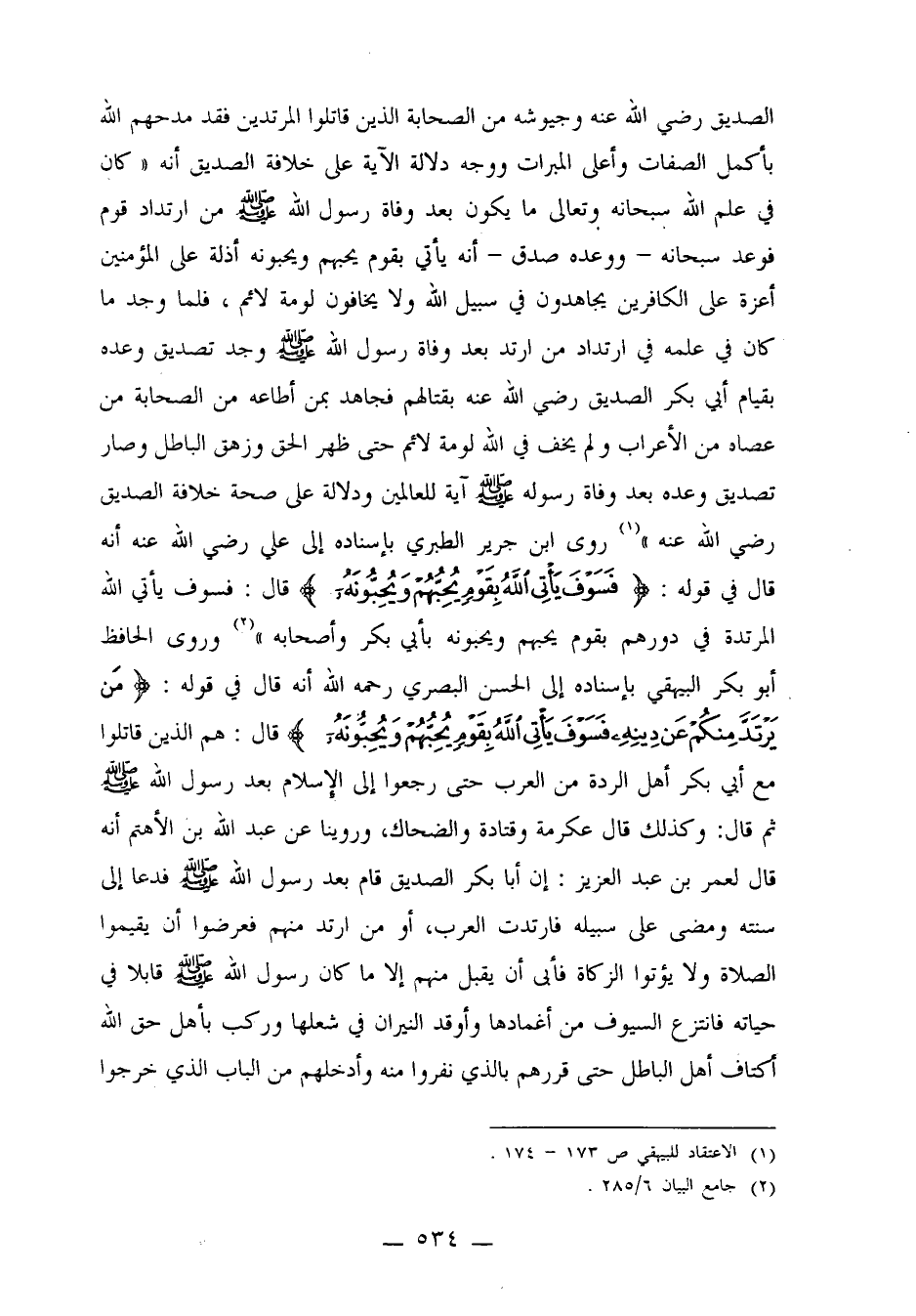 روى ابن جرير الطبري بإسناده إلى علي رضي الله عنه أنه قال في قوله: {فَسَوْفَ يَأْتِي اللَّهُ بِقَوْمٍ يُحِبُّهُمْ وَيُحِبُّونَهُ} قال: فسوف يأتي الله المرتدة في دورهم بقوم يحبهم ويحبونه بأبي بكر وأصحابه"2 وروى الحافظ أبو بكر البيهقي بإسناده إلى الحسن البصري رحمه الله أنه قال في قوله: {مَنْ يَرْتَدَّ مِنْكُمْ عَنْ دِينِهِ فَسَوْفَ يَأْتِي اللَّهُ بِقَوْمٍ يُحِبُّهُمْ وَيُحِبُّونَهُ} قال: هم الذين قاتلوا مع أبي بكر أهل الردة من العرب حتى رجعوا إلى الإسلام بعد رسول الله صلى الله عليه وسلم ثم قال: وكذلك قال عكرمة وقتادة والضحاك، وروينا عن عبد الله بن الأهتم أنه قال لعمر بن عبد العزيز: إن أبا بكر قام بعد رسول الله صلى الله عليه وسلم فدعا إلى سنته ومضى على سبيله فارتدت العرب، أو من ارتد منهم فعرضوا أن يقيموا الصلاة ولا يؤتوا الزكاة فأبى أن يقبل منهم إلا ما كان رسول الله صلى الله عليه وسلم قابلاً في حياته فانتزع السيوف من أغمادها وأوقد النيران في شعلها وركب بأهل حق الله أكتاف أهل الباطل حتى قررهم بالذي نفروا منه وأدخلهم من الباب الذي خرجوا
