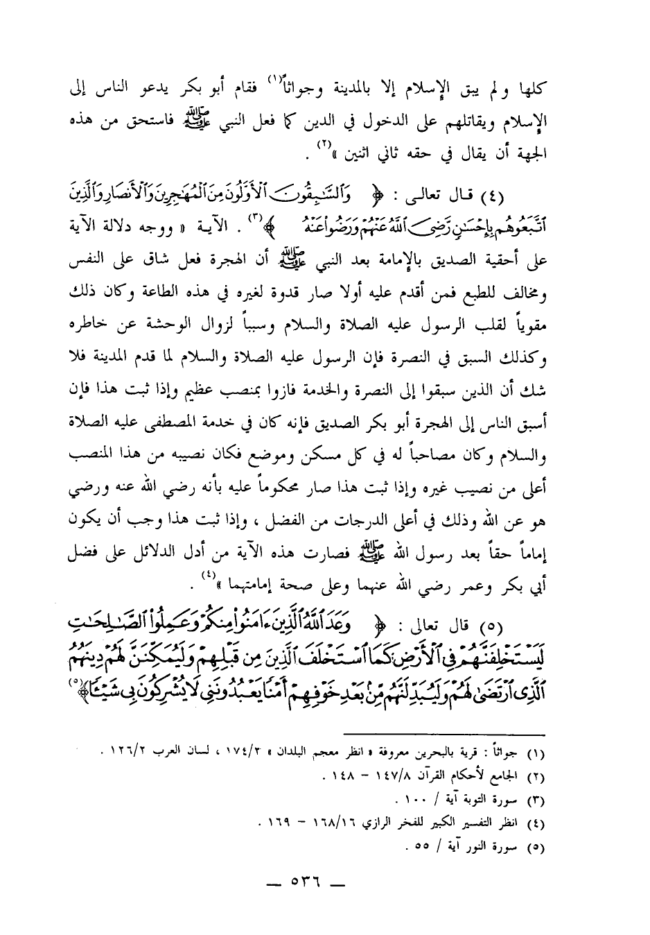 4/ قال تعالى: {وَالسَّابِقُونَ الأَوَّلُونَ مِنَ الْمُهَاجِرِينَ وَالأَنْصَارِ وَالَّذِينَ اتَّبَعُوهُمْ بِإِحْسَانٍ رَضِيَ اللَّهُ عَنْهُمْ وَرَضُوا عَنْهُ} 3. الآية "ووجه دلالة الآية على أحقية الصديق بلإمامة بعد النبي صلى الله عليه وسلم أن الهجرة فعل شاق على النفس ومخالف للطبع فمن أقدم عليه أولا صار قدوة لغيره في هذه الطاعة وكان ذلك مقوياً لقلب الرسول عليه الصلاة والسلام وسبباً لزوال الوحشة عن خاطره وكذلك السبق في النصرة فإن الرسول عليه الصلاة والسلام لما قدم المدينة فلا شك أن الذين سبقوا إلى النصرة والخدمة فازوا بمنصب عظيم وإذا ثبت هذا فإن أسبق الناس إلى الهجرة أبو بكر الصديق فإنه في خدمة المصطفى عليه الصلاة والسلام وكان مصاحباً له في كل مسكن وموضع فكان نصيبه من هذا المنصب أعلى من نصيب غيره وإذا ثبت هذا صار محكوماً عليه بأنه رضي الله عنه ورضي هو عن الله وذلك في أعلى الدرجات من الفضل، وإذا ثبت هذا وجب أن يكون إماماً حقاً بعد رسول الله صلى الله عليه وسلم فصارت هذه الآية من أدل الدلائل على فضل أبي بكر وعمر رضي الله عنهما وعلى صحة إمامتهما"4.