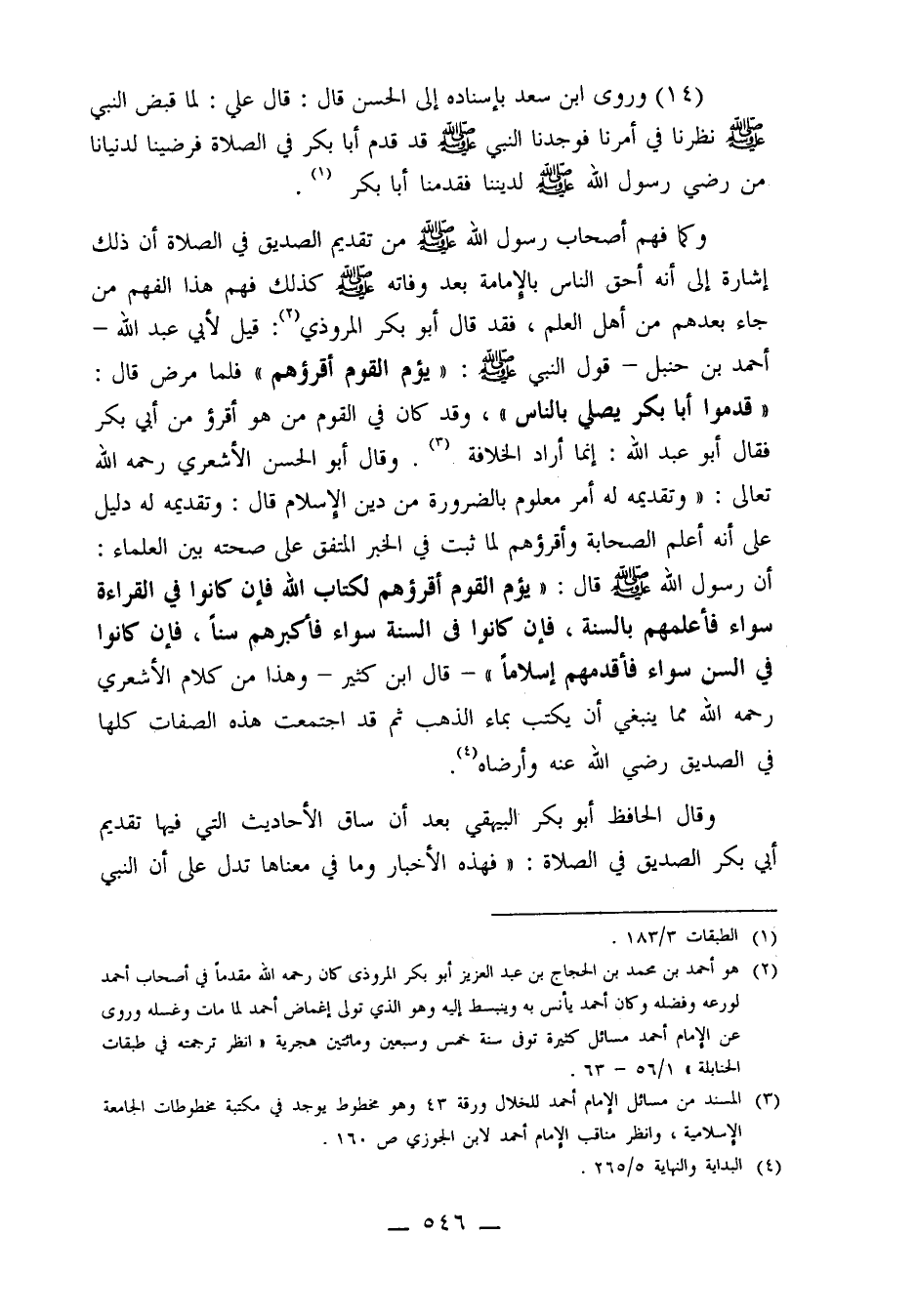 وقال أبو الحسن الأشعري رحمه الله تعالى: "وتقديمه له أمر معلوم بالضرورة من دين الإسلام قال: وتقديمه له دليل على أنه أعلم الصحابة وأقرؤهم لما ثبت في الخبر المتفق على صحته بين العلماء: أن رسول الله صلى الله عليه وسلم قال: "يؤم القوم أقرؤهم لكتاب الله فإن كانوا في القراءة سواء فأعلمهم بالسنة، فإن كانوا في السنة سواء فأكبرهم سناً، فإن كانوا في السن سواء فأقدمهم إسلاماً" قال ابن كثير ـ وهذا من كلام الأشعري رحمه الله مما ينبغي أن يكتب بماء الذهب ثم قد اجتمعت هذه الصفات كلها في الصديق رضي الله عنه وأرضاه4.