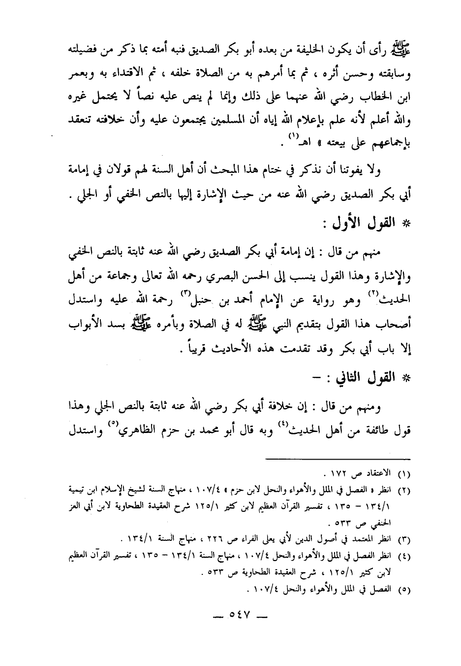 ومنهم من قال: إن خلافة أبي بكر رضي الله عنه ثابتة بالنص الجلي وهذا قول طائفة من أهل الحديث4 وبه قال أبو محمد بن حزم الظاهري5 واستدل