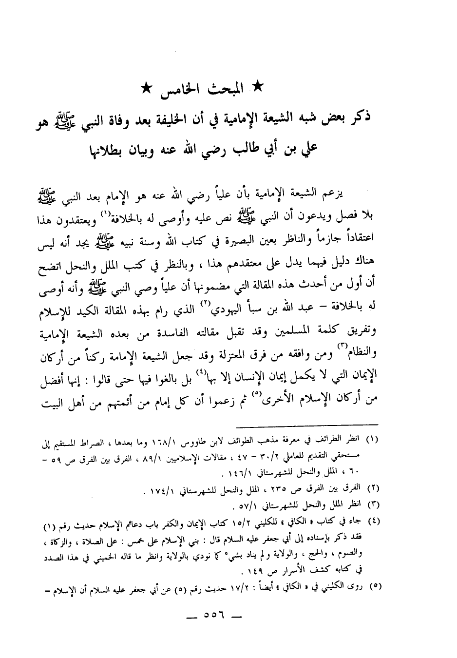 المبحث الخامس: ذكر بعض شبه الشيعة الإمامية في أن الخليفة بعد وفاة النبي صلى الله عليه وسلم هو علي بن أبي طالب رضي الله عنه وبيان بطلانها