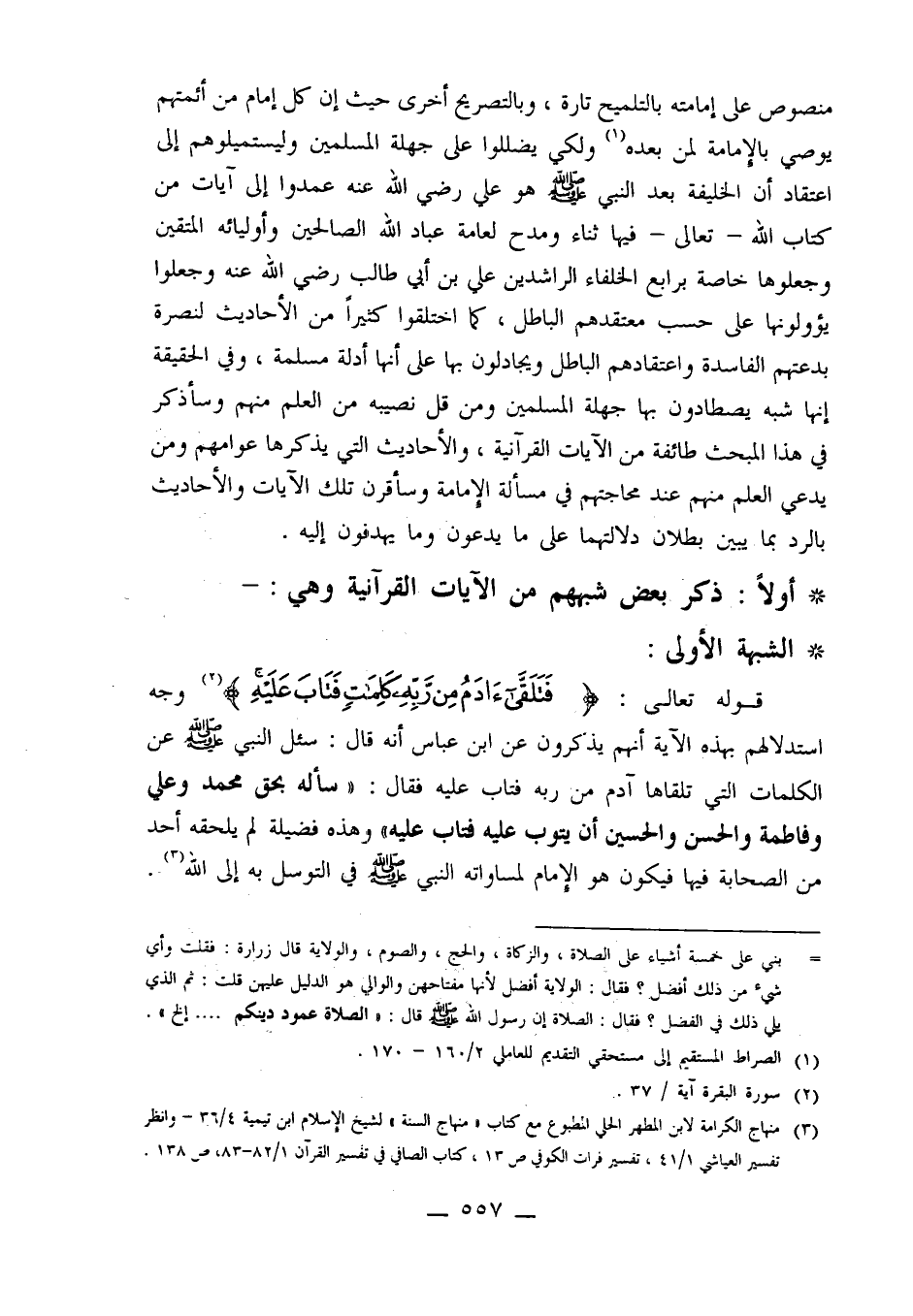 قوله تعالى: {فَتَلَقَّى آدَمُ مِنْ رَبِّهِ كَلِمَاتٍ فَتَابَ عَلَيْهِ} 2 وجه استدلالهم بهذه الآية أنهم يذكرون عن ابن عباس أنه قال: سئل النبي صلى الله عليه وسلم عن الكلمات التي تلقاها آدم من ربه فتاب عليه فقال: "سأله بحق محمد وعلي وفاطمة والحسن والحسين أن يتوب عليه فتاب عليه" وهذه فضيلة لم يلحقه أحد من الصحابة فيها فيكون هو الإمام لمساواته النبي صلى الله عليه وسلم في التوسل به إلى الله3.