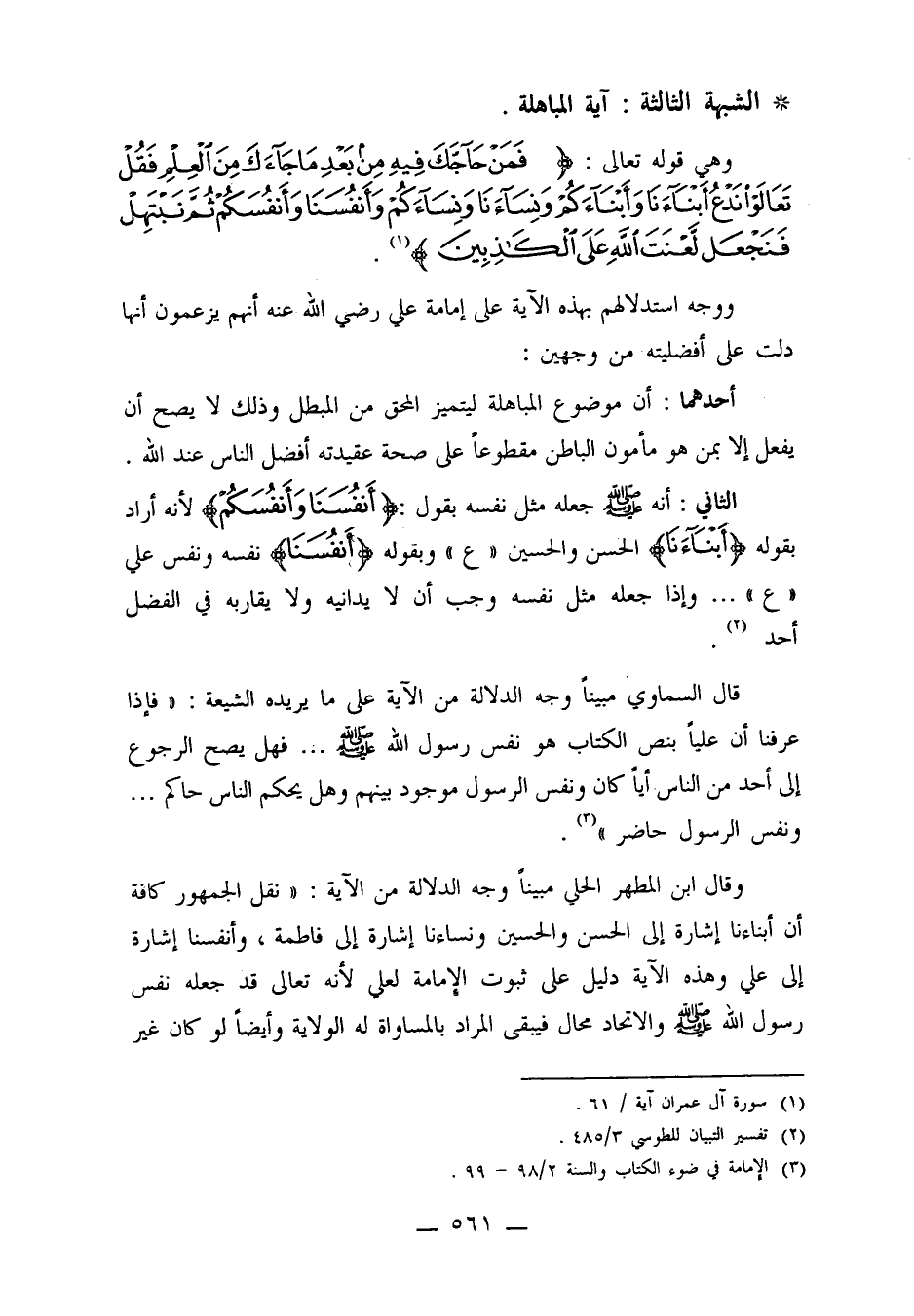 وقال ابن المطهر الحلي مبيناً وجه الدلالة من الآية: "نقل الجمهور كافة أن أبناءنا إشارة إلى الحسن والحسين ونساءنا إشارة إلى فاطمة، وأنفسنا إشارة إلى علي وهذه الآية دليل على ثبوت الإمامة لعلي لأنه تعالى قد جعله نفس رسول الله صلى الله عليه وسلم والاتحاد محال فيبقى المراد بالمساواة له الولاية وأيضاً لو كان غير