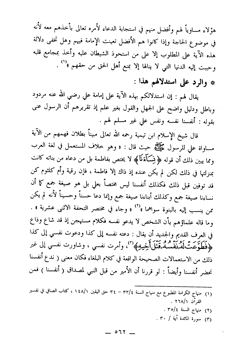 قال شيخ الإسلام ابن تيمية رحمه الله تعالى مبيناً بطلان فهمهم من الآية مساواة علي للرسول صلى الله عليه وسلم حيث قال: "وهو خلاف المستعمل في لغة العرب ومما يبين ذلك أن قوله: {نساءنا} لا يختص بفاطمة بل من دعاه من بناته كانت بمنزلتها في ذلك لكن لم يكن عنده إذ ذاك إلا فاطمة، فإن رقية وأم كلثوم كن قد توفين قبل ذلك فكذلك أنفسنا ليس مختصاً بعلي بل هو صيغة جمع كما أن نساءنا صيغة جمع وكذلك أبناءنا صيغة جمع وإنما دعا حسناً وحسيناً لأنه لم يكن ممن ينسب إليه بالبنوة سواهما"2 "وجاء في مختصر التحفة الاثنى عشرية" وما قاله علماؤهم بأن الشخص لا يدعو نفسه فكلام مستهجن إذ قد شاع وذاع في العرف القديم والجديد أن يقال: دعته نفسه إلى كذا ودعوت نفسي إلى كذا {فَطَوَّعَتْ لَهُ نَفْسُهُ قَتْلَ أَخِيهِ} 3، وأمرت نفسي، وشاورت نفسي إلى غير ذلك من الاستعمالات الصحيحة الواقعة في كلام البلغاء فكان معنى (ندع أنفسنا) نحضر أنفسنا وأيضاً: لو قررنا أن الأمير من قبل النبي لمصداق (أنفسنا) فمن