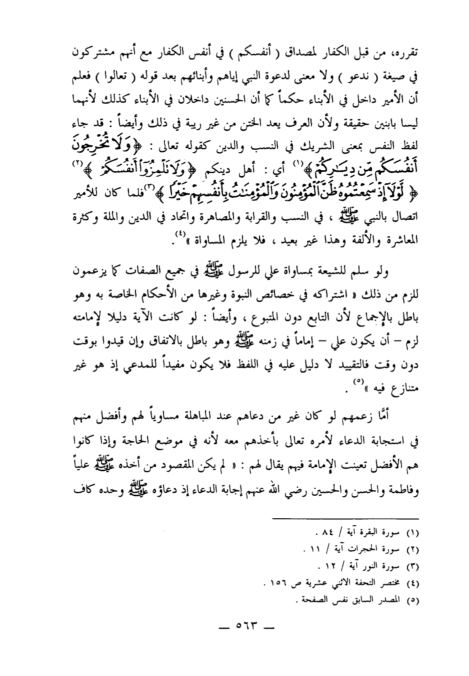 تقرره، من قبل الكفار لمصداق (أنفسكم) في أنفس الكفار مع أنهم مشتركون في صيغة (ندعو) ولا معنى لدعوة النبي إياهم وأبناءهم بعد قوله: (تعالوا) فعلم أن الأمير داخل في الأبناء حكماً كما أن الحسنين داخلان في الأبناء كذلك لأنهما ليسا بابنين حقيقة ولأن العرف يعد الختن من غير ريبة في ذلك وأيضاً: قد جاء لفظ النفس بمعنى الشريك في النسب والدين كقوله تعالى: {وَلا تُخْرِجُونَ أَنْفُسَكُمْ مِنْ دِيَارِكُمْ} 1 أي: أهل دينكم {وَلا تَلْمِزُوا أَنْفُسَكُمْ} 2 {لَوْلا إِذْ سَمِعْتُمُوهُ ظَنَّ الْمُؤْمِنُونَ وَالْمُؤْمِنَاتُ بِأَنْفُسِهِمْ خَيْراً} 3 فلما كان للأمير اتصال بالنبي صلى الله عليه وسلم، في النسب والقرابة والمصاهرة واتحاد في الدين والملة وكثرة المعاشرة والألفة وهذا غير بعيد فلا يلزم المساواة"4