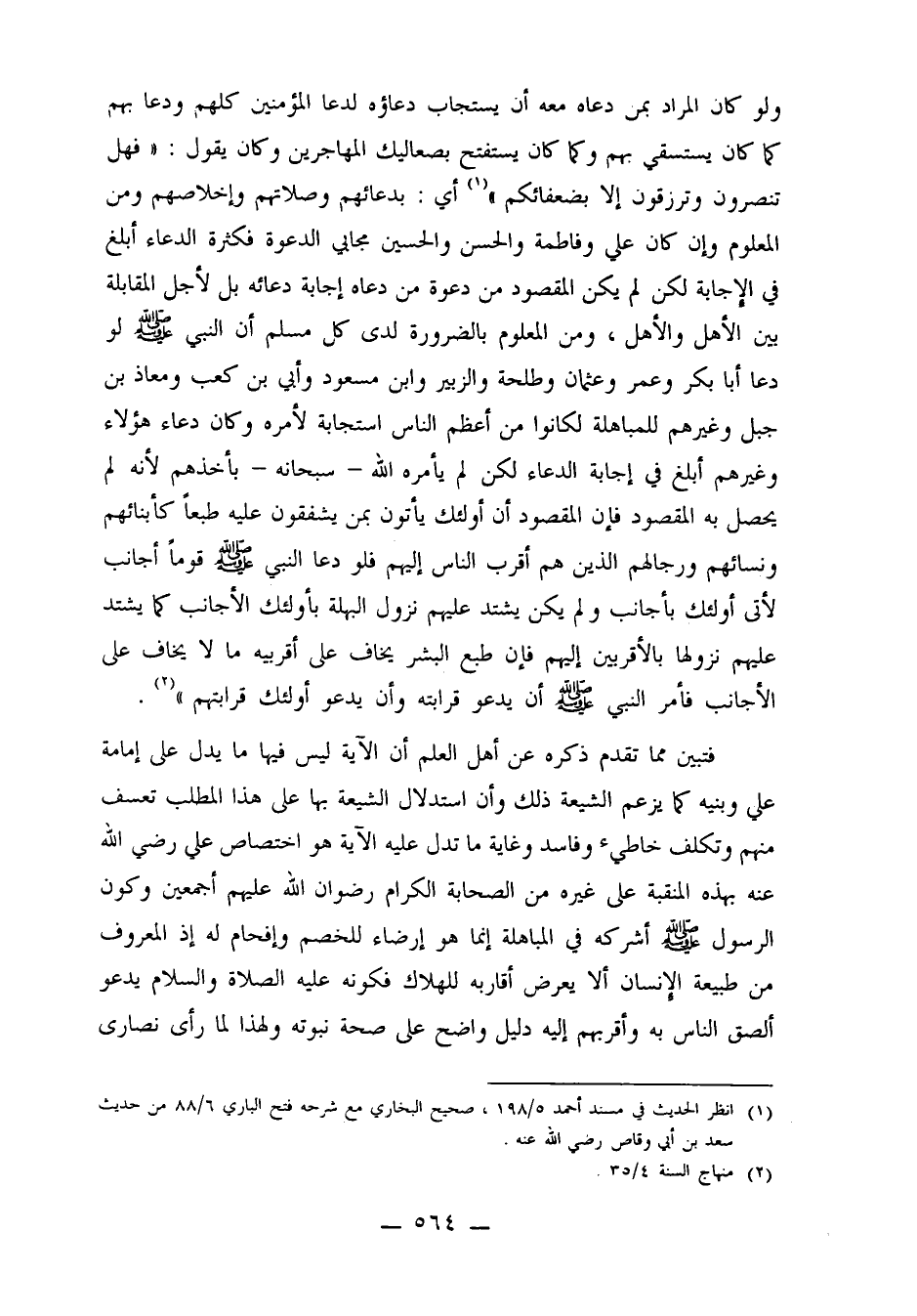 ولو كان المراد بمن دعاه معه أن يستجاب دعاؤه لدعا المؤمنين كلهم ودعا بهم كما كان يستسقي بهم وكما كان يستفتح بصعاليك المهاجرين وكان يقول: "فهل تنصرون وترزقون إلا بضعفائكم"1 أي: بدعائهم وصلاتهم وإخلاصهم ومن المعلوم وإن كان علي وفاطمة والحسن والحسين مجابي الدعوة فكثرة الدعاء أبلغ في الإجابة لكن لم يكن المقصود من دعوة من دعاه إجابة دعائه بل لأجل المقابلة بين الأهل والأهل، ومن المعلوم بالضرورة لدى كل مسلم أن النبي صلى الله عليه وسلم لو دعا أبا بكر وعمر وعثمان وطلحة والزبير وابن مسعود وأبي بن كعب ومعاذ بن جبل وغيرهم للمباهلة لكانوا من أعظم الناس استجابة لأمره وكان دعاء هؤلاء وغيرهم أبلغ في إجابة الدعاء لكن لم يأمره الله ـ سبحانه ـ بأخذهم لأنه لم يحصل به المقصود فإن المقصود أن أولئك يأتون بمن يشفقون عليه طبعاً كأبنائهم ونسائهم ورجالهم الذين هم أقرب الناس إليهم فلو دعا النبي صلى الله عليه وسلم قوماً أجانب لأتى أولئك بأجانب ولم يكن يشتد عليهم نزول البهلة بأولئك الأجانب كما يشتد عليهم نزولها بالأقربين إليهم فإن طبع البشر يخاف على أقربيه ما لا يخاف على الأجانب فأمر النبي صلى الله عليه وسلم أن يدعو قرابته وأن يدعو أولئك قرابتهم"2.