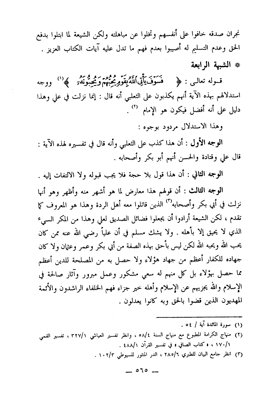 قوله تعالى: {فَسَوْفَ يَأْتِي اللَّهُ بِقَوْمٍ يُحِبُّهُمْ وَيُحِبُّونَهُ} 1 ووجه استدلالهم بهذه الآية أنهم يكذبون على الثعلبي أنه قال: إنما نزلت في علي وهذا دليل على أنه أفضل فيكون هو الإمام2.