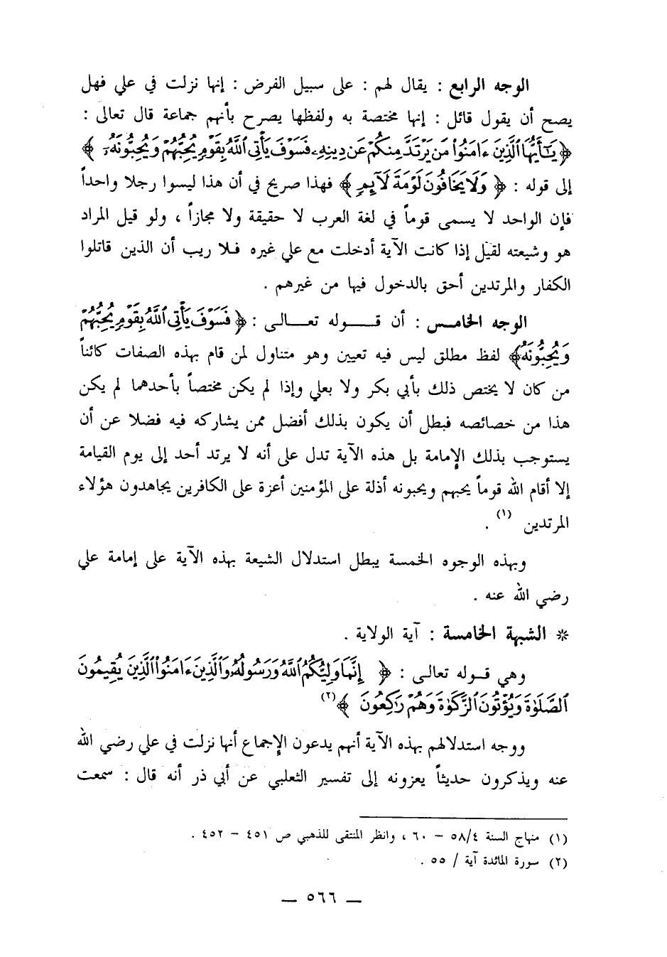 الوجه الرابع: يقال لهم: على سبيل الفرض: إنها نزلت في علي فهل يصح أن يقول قائل: إنها مختصة به ولفظها يصرح بأنهم جماعة قال تعالى: {يَا أَيُّهَا الَّذِينَ آمَنُوا مَنْ يَرْتَدَّ مِنْكُمْ عَنْ دِينِهِ فَسَوْفَ يَأْتِي اللَّهُ بِقَوْمٍ يُحِبُّهُمْ وَيُحِبُّونَهُ} إلى قوله: {وَلا يَخَافُونَ لَوْمَةَ لائِمٍ} فهذا صريح في أن هذا ليسوا رجلا واحداً فإن الواحد لا يسمى قوماً في لغة العرب لا حقيقة ولا مجازاً، ولو قيل: المراد هو شيعته لقيل إذا كانت الآية أدخلت مع علي غيره فلا ريب أن الذين قاتلوا الكفار والمرتدين أحق بالدخول فيها من غيرهم.