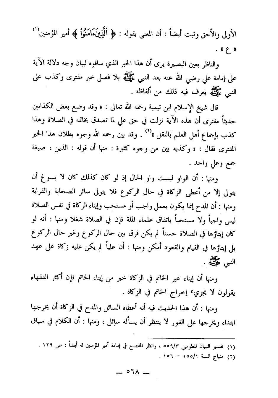 ومنها: أن الواو ليست واو الحال إذ لو كان كذلك كان لا يسوغ أن يتولى إلا من أعطى الزكاة في حال الركوع فلا يتولى سائر الصحابة والقرابة ومنها: أن المدح إنما يكون بعمل واجب أو مستحب وإيتاء الزكاة في نفس الصلاة ليس واجباً ولا مستحباً باتفاق علماء الملة فإن في الصلاة شغلاً ومنها: أنه لو كان إيتاؤها في الصلاة حسناً لم يكن فرق بين حال الركوع وغير حال الركوع بل إيتاؤها في القيام والقعود أمكن ومنها: أن علياً لم يكن عليه زكاة على عهد النبي صلى الله عليه وسلم.