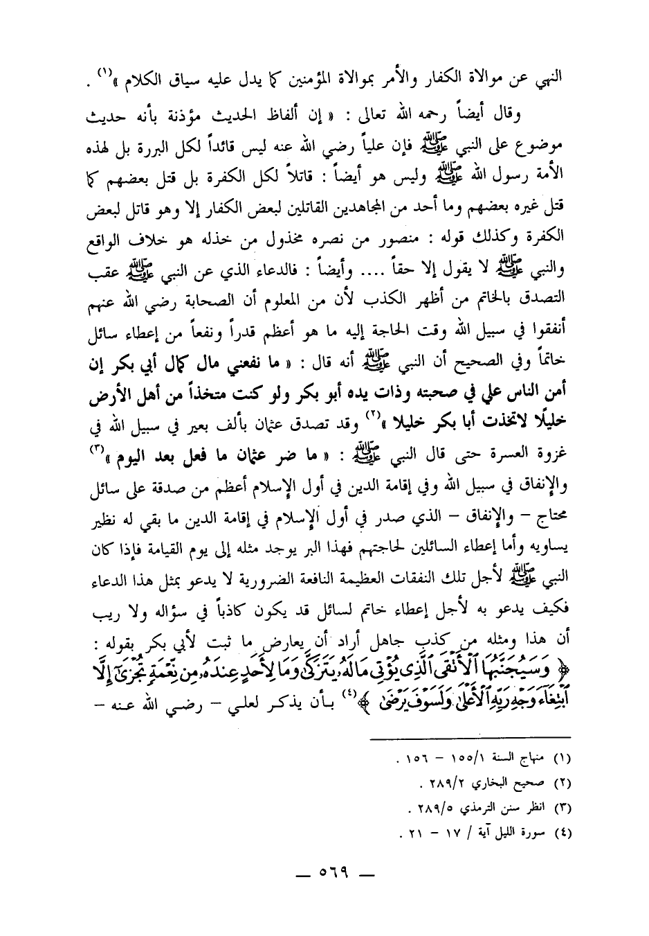 والإنفاق في سبيل الله وفي إقامة الدين في أول الإسلام أعظم من صدقة على سائل محتاج ـ والإنفاق ـ الذي صدر في أول الإسلام في إقامة الدين ما بقي له نظير يساويه وأما إعطاء السائلين لحاجتهم فهذا البر يوجد مثله إلى يوم القيامة فإذا كان النبي صلى الله عليه وسلم لأجل تلك النفقات العظيمة النافعة الضرورية لا يدعو بمثل هذا الدعاء فكيف يدعو هذه لأجل إعطاء خاتم لسائل قد يكون كاذباً في سؤاله ولا ريب أن هذا ومثله من كذب جاهل أراد أن يعارض ما ثبت لأبي بكر بقوله: {وَسَيُجَنَّبُهَا الأَتْقَى * الَّذِي يُؤْتِي مَالَهُ يَتَزَكَّى * وَمَا لأَحَدٍ عِنْدَهُ مِنْ نِعْمَةٍ تُجْزَى * إِلاَّ ابْتِغَاءَ وَجْهِ رَبِّهِ الأَعْلَى * وَلَسَوْفَ يَرْضَى} 4 بأن يذكر لعلي رضي الله عنه