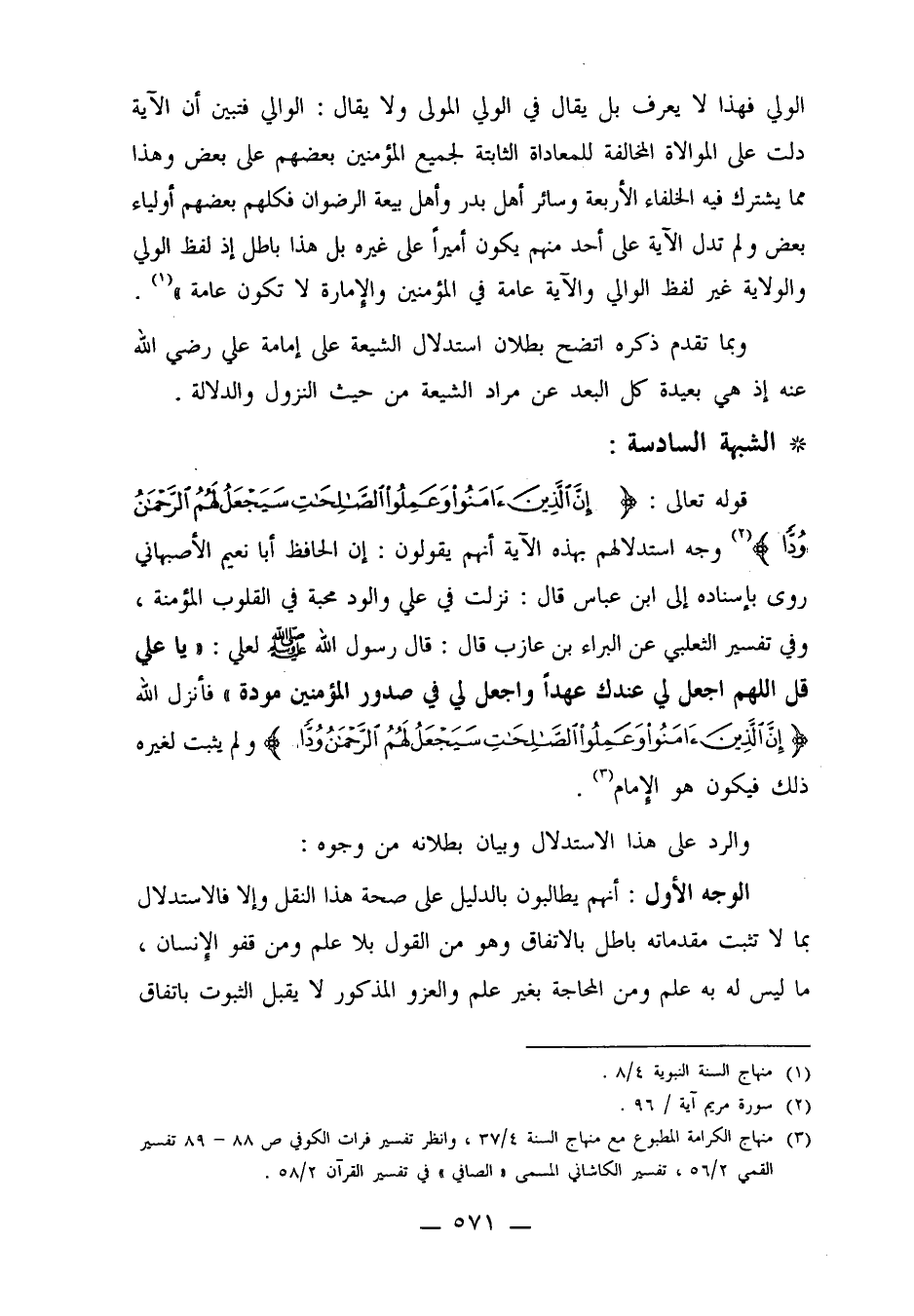 قوله تعالى: {إِنَّ الَّذِينَ آمَنُوا وَعَمِلُوا الصَّالِحَاتِ سَيَجْعَلُ لَهُمُ الرَّحْمَنُ وُدّاً} 2 وجه استدلالهم بهذه الآية أنهم يقولون: إن الحافظ أبا نعيم الأصبهاني روى بإسناده إلى ابن عباس قال: نزلت في علي والود محبة في القلوب المؤمنة، وفي تفسير الثعلبي عن البراء بن عازب قال: قال رسول الله صلى الله عليه وسلم لعلي: "يا علي قل اللهم اجعل لي عندك عهداً واجعل لي في صدور المؤمنين مودة" فأنزل الله: {إِنَّ الَّذِينَ آمَنُوا وَعَمِلُوا الصَّالِحَاتِ سَيَجْعَلُ لَهُمُ الرَّحْمَنُ وُدّاً} ولم يثبت لغيره ذلك فيكون هو الإمام3.
