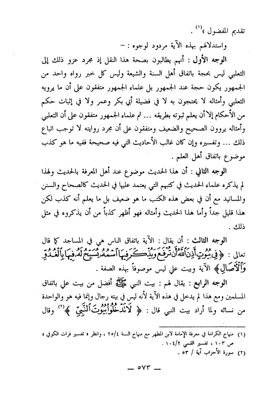الوجه الأول: أنهم يطالبون بصحة هذا النقل إذ مجرد عزو ذلك إلى الثعلبي ليس بحجة باتفاق أهل السنة والشيعة وليس كل خبر رواه واحد من الجمهور يكون حجة عند الجمهور بل علماء الجمهور بل علماء الجمهور متفقون على أن ما يرويه الثعلبي وأمثاله لا يحتجون به لا في فضيلة أبي بكر وعمر ولا في إثبات حكم من الأحكام إلا أن يعلم ثبوته بطريقه ... ثم علماء الجمهور متفقون على أن الثعلبي وأمثاله يروون الصحيح والضعيف ومتفقون على أن مجرد روايته لا توجب اتباع ذلك ... وتفسيره وإن كان غالب الأحاديث التي فيه صحيحة ففيه ما هو كذب موضوع باتفاق أهل العلم.