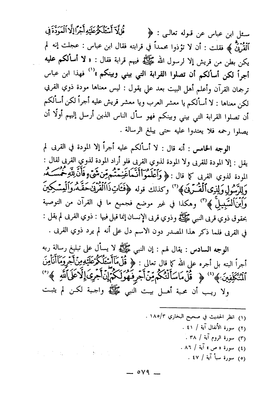 فهذا ابن عباس ترجمان القرآن وأعلم أهل البيت بعد علي ليس معناها مودة ذي القربى لكن معناها: لا أسألكم يا معشر العرب ويا معشر قريش عليه أجراً لكن أسألكم أن تصلوا القرابة التي بيني وبينكم، فهو سأل الناس الذين أرسل إليهم أولاً أن يصلوا رحمه فلا يعتدوا عليه حتى يبلغ الرسالة.