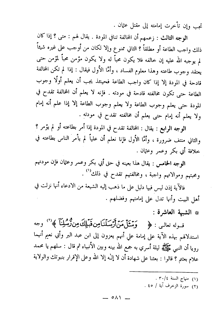 الوجه الثالث: زعمهم أن المخالفة تنافي المودة. يقال لهم: متى؟ إذا كان ذلك واجب الطاعة أو مطلقاً؟ الثاني ممنوع وإلا لكان من أوجب على غيره شيئاً لم يوجبه الله عليه إن خالفه فلا يكون محباً له ولا يكون مؤمن محباً لمؤمن حتى يعتقد وجوب طاعته وهذا معلوم الفساد، وأما الأول فيقال: إذا لم تكن تلك المخالفة قادحة في المودة إلا إذا كان واجب الطاعة فحينئذ يجب أن يعلم أولاً وجوب الطاعة حتى تكون مخالفته قادحة في مودته فإنه لا يعلم أن المخالفة تقدح في المودة حتى يعلم وجوب الطاعة ولا يعلم وجوب الطاعة إلا إذا علم أنه إمام ولا يعلم أنه إمام حتى يعلم أن مخالفته تقدح في مودته.