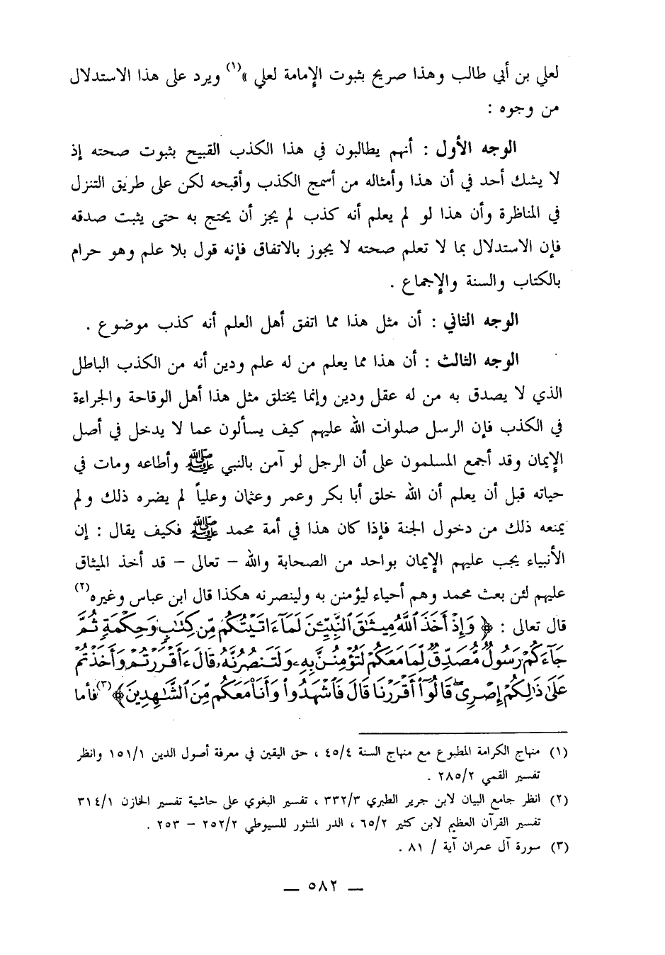 لعلي بن أبي طالب وهذا صريح في ثبوت الإمامة لعلي"1. ويرد على هذا الاستدلال من وجوه: