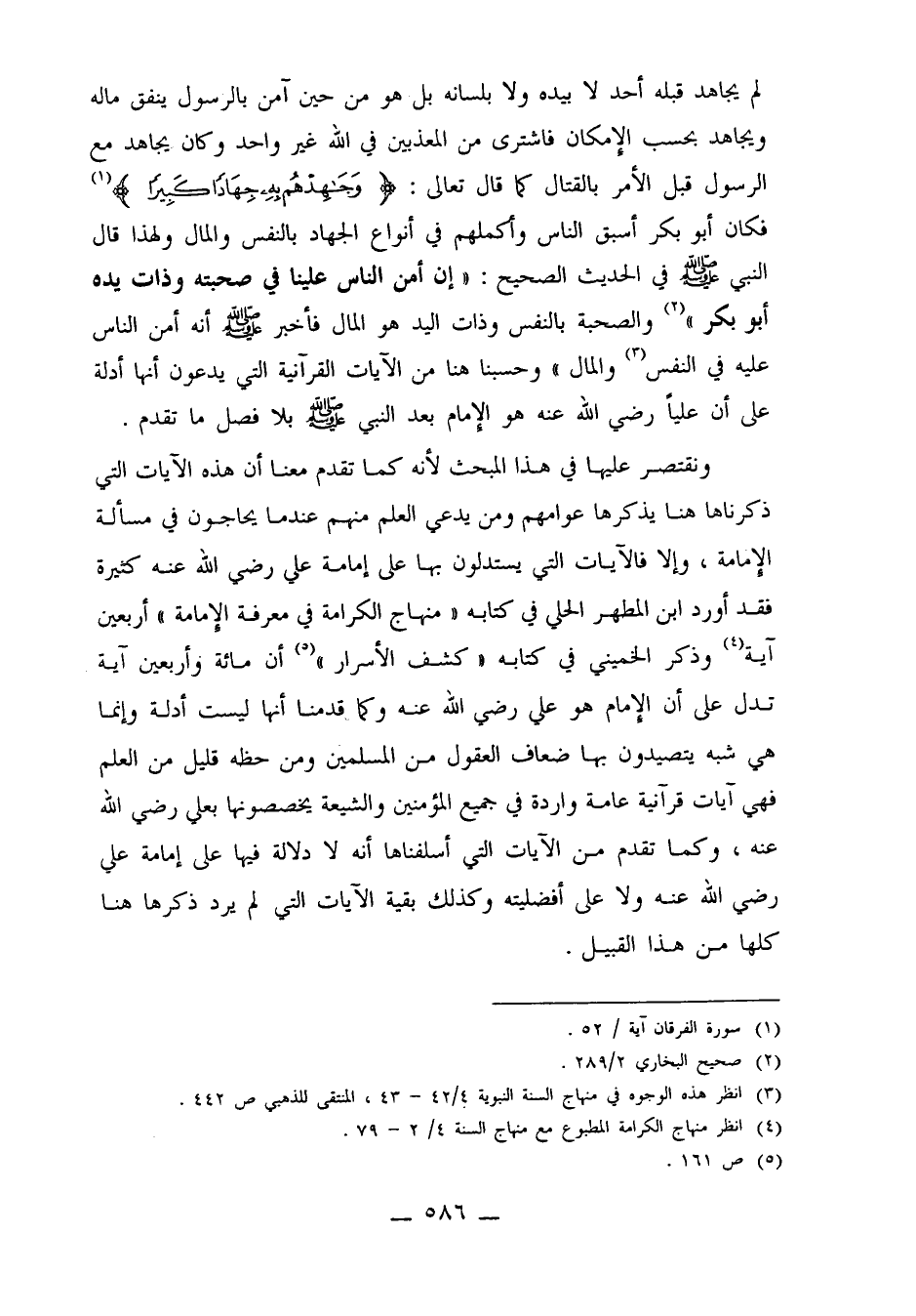 فكان أبو بكر أسبق الناس وأكملهم في أنواع الجهاد بالنفس والمال ولهذا قال النبي صلى الله عليه وسلم في الحديث الصحيح: "إن أمن الناس علينا في صحبته وذات يده أبو بكر" 2. والصحبة بالنفس وذات اليد هو المال فأخبر صلى الله عليه وسلم أنه أمنّ الناس عليه في النفس3 والمال" وحسبنا هنا من الآيات القرآنية التي يدعون أنها أدلة على أن علياً رضي الله عنه هو الإمام بعد النبي صلى الله عليه وسلم بلا فصل ما تقدم. ونقتصر عليها في هذا المبحث لأنه كما تقدم معنا أن هذه الآيات التي ذكرناها هنا يذكرها عوامهم ومن يدعي العلم منهم عندما يحاجون في مسألة الإمامة وإلا فالآيات التي يستدلون بها على إمامة علي رضي الله عنه كثيرة فقد أورد ابن المطهر الحلي في كتابه "منهاج الكرامة في معرفة الإمامة" أربعين آية4 وذكر الخميني في كتبابه "كشف الأسرار"5 أن مائة وأربعين آية تدل على أن الإمام هو علي رضي الله عنه وكما قدمنا أنها ليست أدلة وإنما هي شبه يتصيدون بها ضعاف العقول من المسلمين ومن حظه قليل من العلم فهي آيات قرآنية عامة واردة في جميع المؤمنين والشيعة يخصصونها بعلي رضي الله عنه، وكما تقدم من الآيات التي أسلفناها أنه لا دلالة فيها على إمامة علي رضي الله عنه ولا على أفضليته وكذلك بقية الآيات التي لم يرد ذكرها هنا كلها من هذا القبيل.