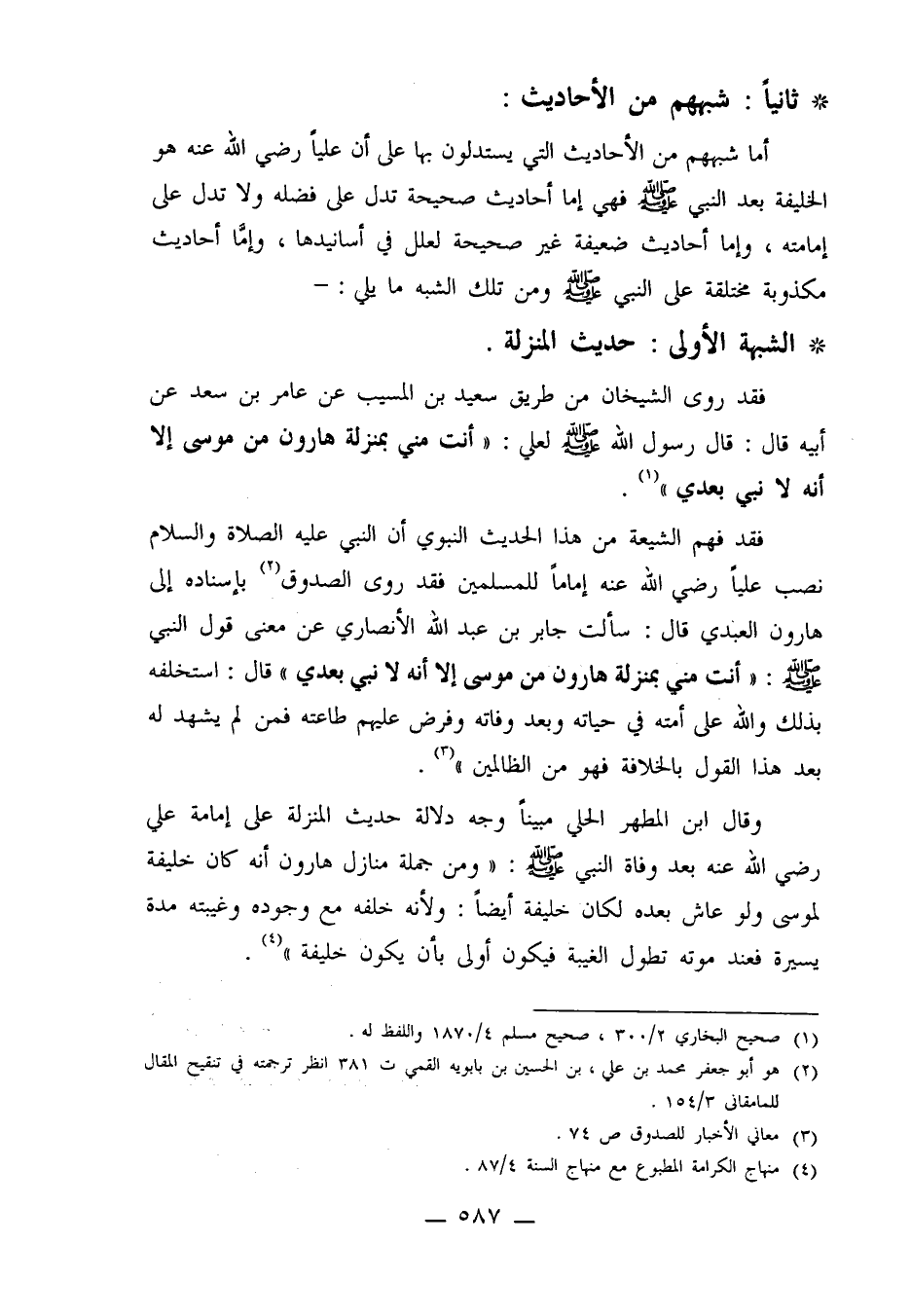 الشبهة الأولى: حديث المنزلة، فقد روى الشيخان من طريق سعيد بن المسيب عن عامر بن سعد عن ابيه قال: قال رسول الله صلى الله عليه وسلم لعلي: "أنت مني بمنزلة هارون من موسى إلا أنه لا نبي بعدي" 1 فقد فهم الشيعة من هذا الحديث النبوي أن النبي عليه الصلاة والسلام نصب علياً رضي الله عنه إماماً للمسلمين فقد روى الصدوق2 بإسناده إلى هارون العبدي قال: سألت جابر بن عبد الله الأنصاري عن معنى قول النبي صلى الله عليه وسلم: "أنت مني بمنزلة هارون من موسى إلا أنه لا نبي بعدي" قال: استخلفه بذلك والله على أمته في حياته وبعد وفاته وفرض عليهم طاعته فمن لم يشهد له بعد هذا القول بالخلافة فهو من الظالمين3 وقال ابن المطهر الحلي مبيناً وجه دلالة حديث المنزلة على إمامة علي رضي الله عنه بعد وفاة النبي صلى الله عليه وسلم: "ومن جملة منازل هارون أنه كان خليفة لموسى ولو عاش بعده لكان خليفة أيضاً: ولأنه خلفه مع وجوده وغيبته مدة يسيرة فعند موته تطول الغيبة فيكون أولى بأن يكون خليفة"4.