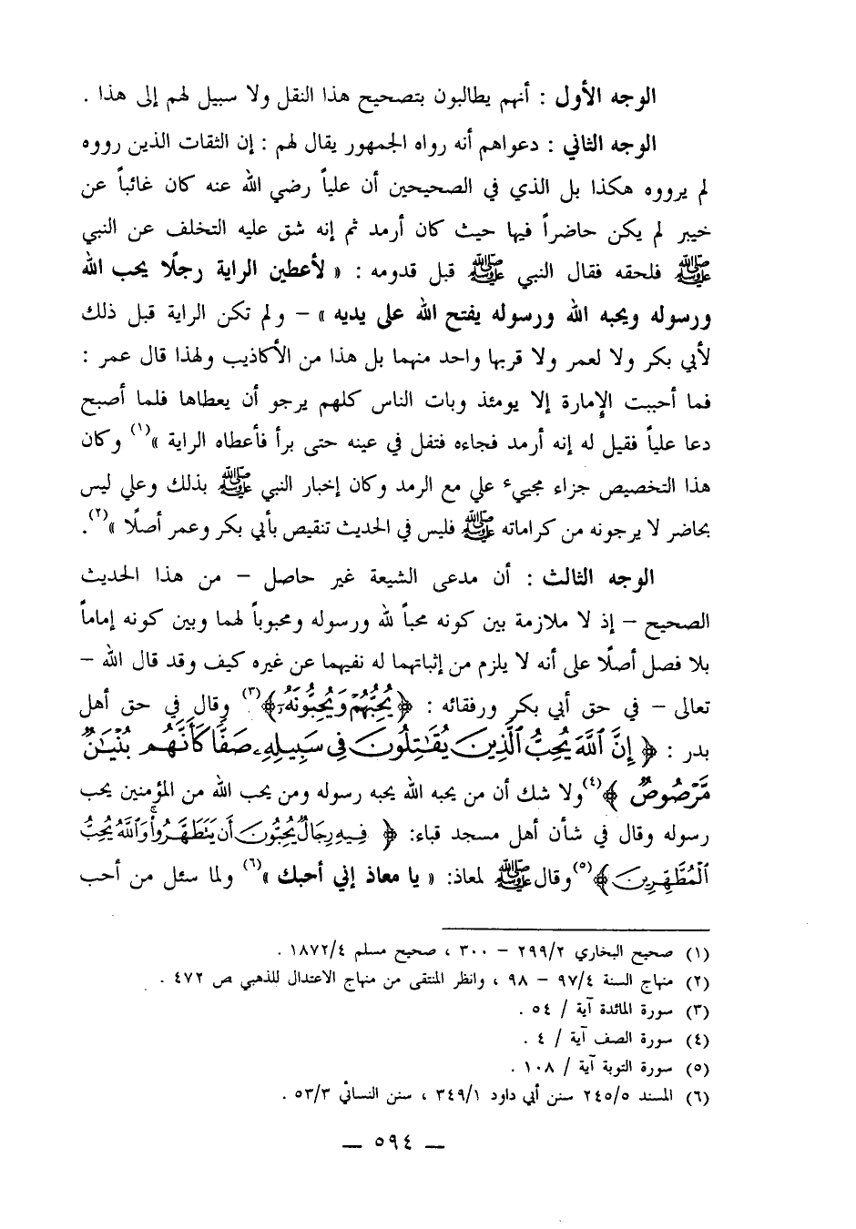 الوجه الثالث: أن مدعى الشيعة غير حاصل ـ من هذا الحديث الصحيح ـ إذ لا ملازمة بين كونه محباً لله ورسوله ومحبوباً لهما وبين كونه إماماً بلا فصل أصلاً على أنه لا يلزم من إثباتهما له نفيهما عن غيره كيف وقد قال الله ـ تعالى ـ في حق أبي بكر ورفقائه {يُحِبُّهُمْ وَيُحِبُّونَهُ} 3 وقال في حق أهل بدر: {إِنَّ اللَّهَ يُحِبُّ الَّذِينَ يُقَاتِلُونَ فِي سَبِيلِهِ صَفّاً كَأَنَّهُمْ بُنْيَانٌ مَرْصُوصٌ} 4. ولا شك أن من يحبه الله يحبه رسوله ومن يحب الله من المؤمنين يحب رسوله وقال في شأن أهل مسجد قباء: {فِيهِ رِجَالٌ يُحِبُّونَ أَنْ يَتَطَهَّرُوا وَاللَّهُ يُحِبُّ الْمُطَّهِّرِينَ} 5. وقال صلى الله عليه وسلم لمعاذ: يا معاذ: "إني أحبك" 6 ولما سئل من أحب