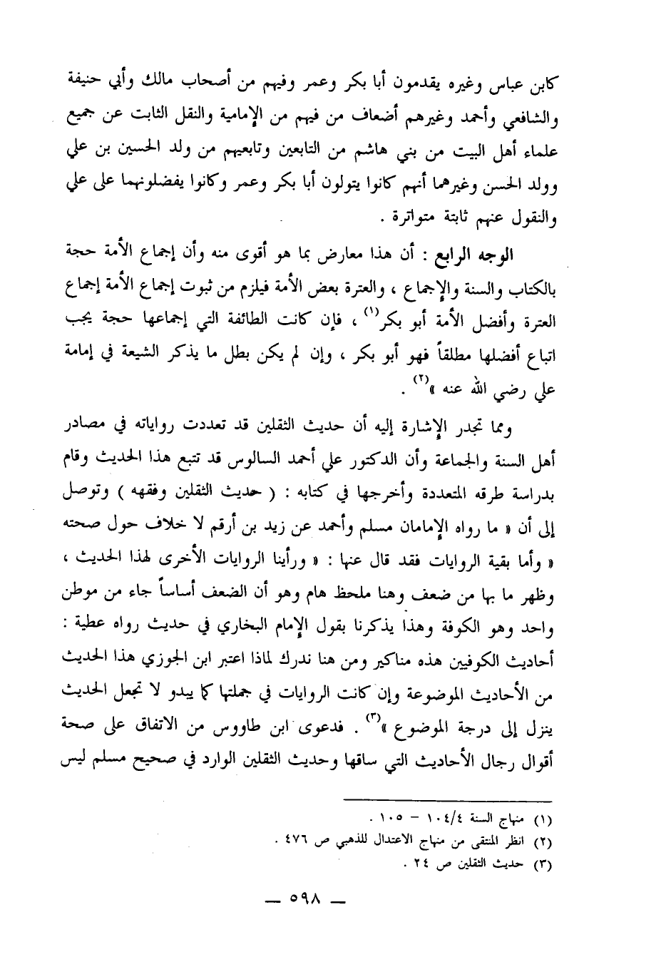 الوجه الرابع: أن هذا معارض بما هو أقوى منه وأن إجماع الأمة حجة بالكتاب والسنة والإجماع، والعترة بعض الأمة فيلزم من ثبوت إجماع الأمة إجماع العترة وأفضل الأمة أبو بكر1 فإن كانت الطائفة التي إجماعها حجة يجب اتباع أفضلها مطلقاً فهو أبو بكر، وإن لم يكن بطل ما يذكر الشيعة في إمامة علي رضي الله عنه"2.