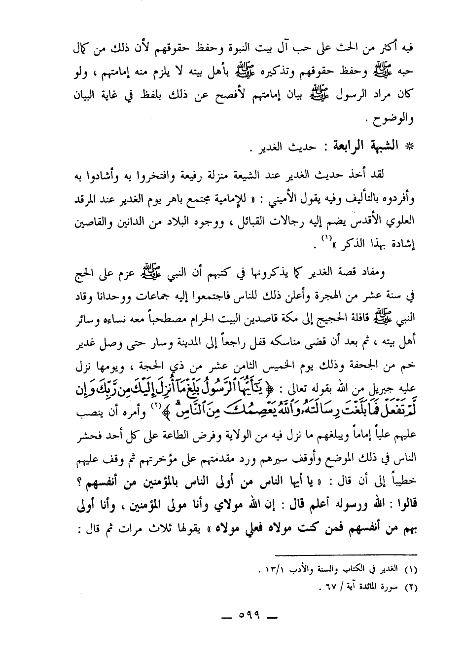 ومفاد قصة الغدير كما يذكرونها في كتبهم أن النبي صلى الله عليه وسلم عزم على الحج في سنة عشر من الهجرة وأعلن ذلك للناس فاجتمعوا إليه جماعات ووحدانا وقاد النبي صلى الله عليه وسلم قافلة الحجيج إلى مكة قاصدين البيت الحرام مصطحباً معه نساءه وسائر أهل بيته، ثم بعد أن قضى مناسكه قفل راجعاً إلى المدينة وسار حتى وصل غدير خم من الجحفة وذلك يوم الخميس الثامن عشر من ذي الحجة ويومها نزل عليه جبريل من الله بقوله تعالى: {يَا أَيُّهَا الرَّسُولُ بَلِّغْ مَا أُنْزِلَ إِلَيْكَ مِنْ رَبِّكَ وَإِنْ لَمْ تَفْعَلْ فَمَا بَلَّغْتَ رِسَالَتَهُ وَاللَّهُ يَعْصِمُكَ مِنَ النَّاسِ} 2 وأمره أن ينصب عليهم علياً إماماً ويبلغهم ما نزل فيه من الولاية وفرض الطاعة على كل أحد فحشر الناس في ذلك الموضع وأوقف سيرهم ورد مقدمتهم على مؤخرتهم ثم وقف عليهم خطيباً إلى أن قال: يا أيها الناس من أولى الناس بالمؤمنين من أنفسهم قالوا: الله ورسوله أعلم، قال: "إن الله مولاي وأنا مولى المؤمنين وأنا أولى بهم من أنفسهم فمن كنت مولاه فعلي مولاه" يقولها ثلاث مرات ثم قال