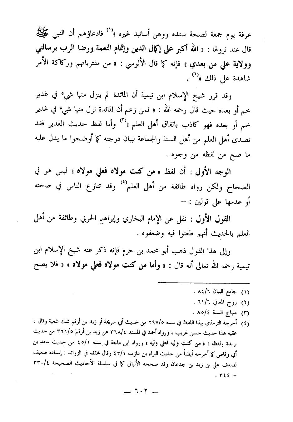 4ـ أخرجه الترمذي بهذا اللفظ في سننه 5/297 من حديث أبي سريحة أو زيد بن أرقم شك شعبة وقال: عقبه هذا حديث حسن غريب، ورواه أحمد في المسند 4/368 عن زيد بن أرقم 5/361 من حديث بريدة ولفظه: "من كنت وليه فعلي وليه" ورواه ابن ماجه في سننه 1/45 من حديث سعد بن أبي وقاص كما أخرجه أيضاً من حديث البراء بن عازب 1/43 وقال محققه في الزوائد: إسناده ضعيف لضعف علي بن زيد بن جدعان وقد صححه الألباني كما في سلسلة الأحاديث الصحيحية 4/330-344.