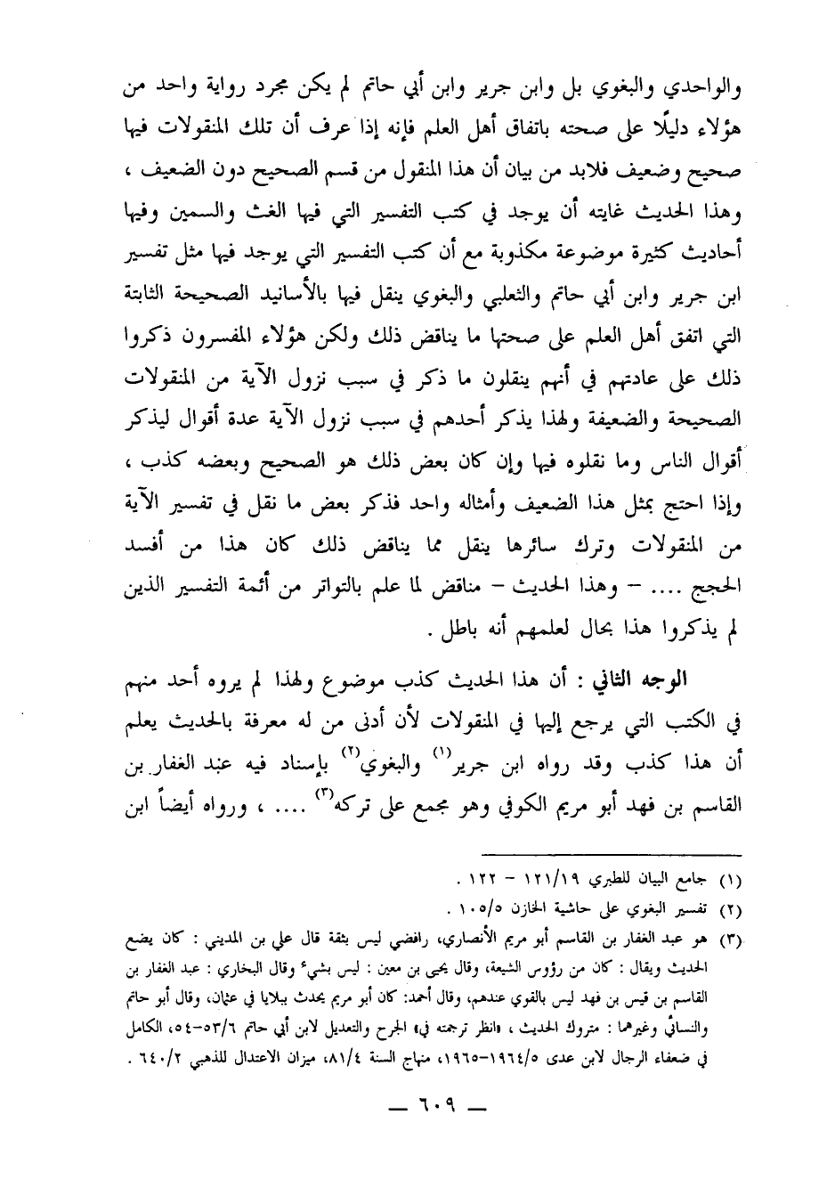 والواحدي والبغوي بل وابن جرير وابن أبي حاتم لم يكن مجرد رواية واحد من هؤلاء دليلاً على صحته باتفاق أهل العلم فإنه إذا عرف أن تلك المنقولات فيها صحيح وضعيف فلا بد من بيان أن هذا المنقول من قسم الصحيح دون الضعيف، وهذا الحديث غايتة أن يوجد في كتب التفسير التي فيها الغث والسمين فيها أحاديث كثيرة موضوعة مكذوبة مع أن كتب التفسير التي يوجد فيها مثل تفسير ابن جرير وابن أبي حاتم والثعلبي والبغوي ينقل فيها بالأسانيد الصحيحة الثابتة التي اتفق أهل العلم على صحتها ما يناقض ذلك ولكن هؤلاء المفسرون ذكروا ذلك على عادتهم في أنهم ينقلون ما ذكر في سبب نزول الآية من المنقولات الصحيحة والضعيفة ولهذا يذكر أحدهم في سبب نزول الآية عدة أقوال يذكر أقوال الناس وما نقلوه فيها وإن كان بعض ذلك هو الصحيح وبعضه كذب، وإذا احتج بمثل هذا الضعيف وأمثاله واحد فذكر بعض ما نقل في تفسير الآية من المنقولات وترك سائرها ينقل مما يناقض ذلك كان هذا من أفسد الحجج.... ـ وهذا الحديث ـ مناقض لما علم بالتواتر من أئمة التفسير الذين لم يذكروا هذا بحال لعلمهم أنه باطل.