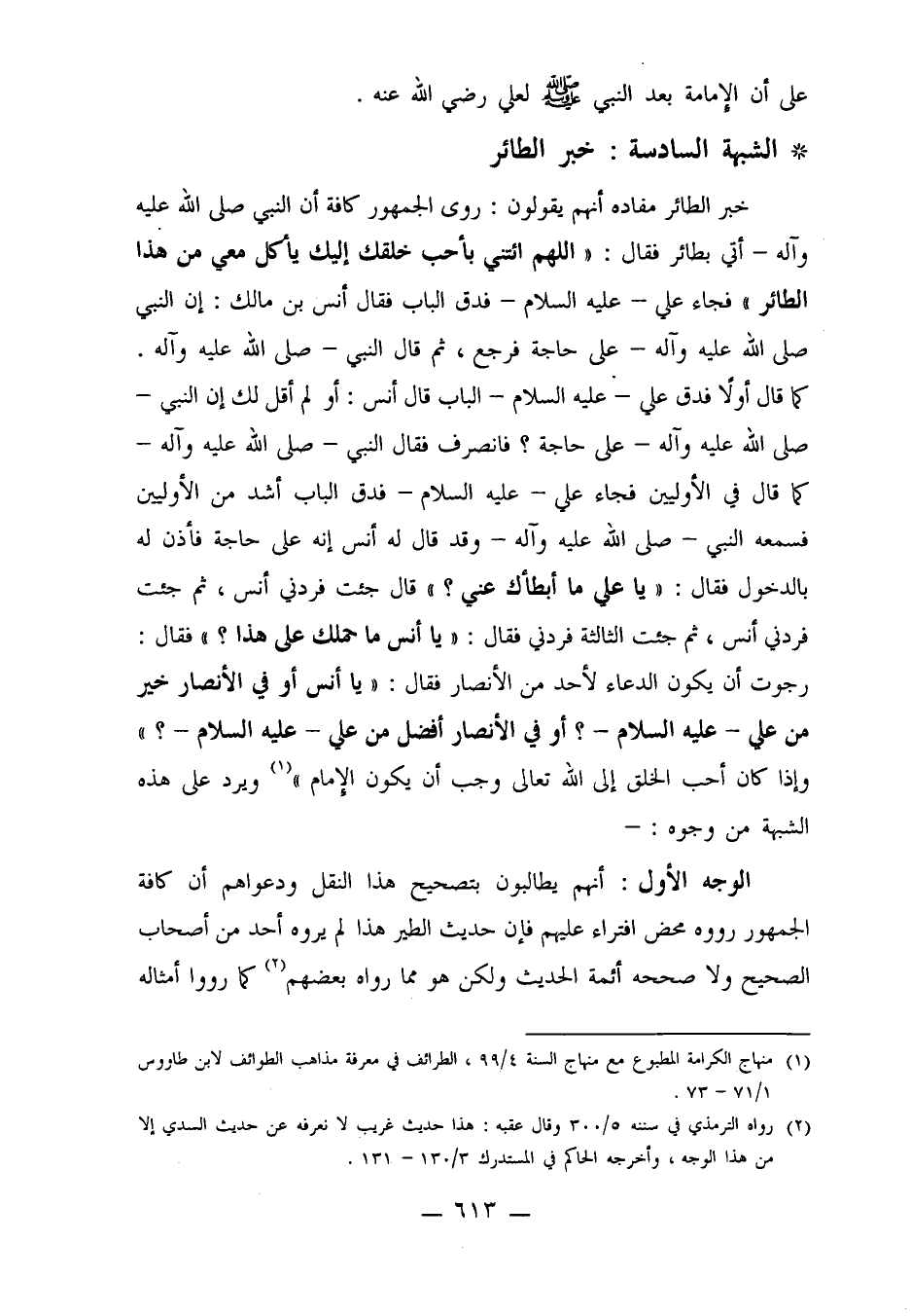 الوجه الأول: أنهم يطالبون بتصحيح هذا النقل ودعواهم أن كافة الجمهور رووه محض افتراء عليه فإن حديث الطير هذا لم يروه أحد من أصحاب الصحيح ولا صححه أئمة الحديث ولكن هو مما رواه بعضهم2 كما رووا أمثاله