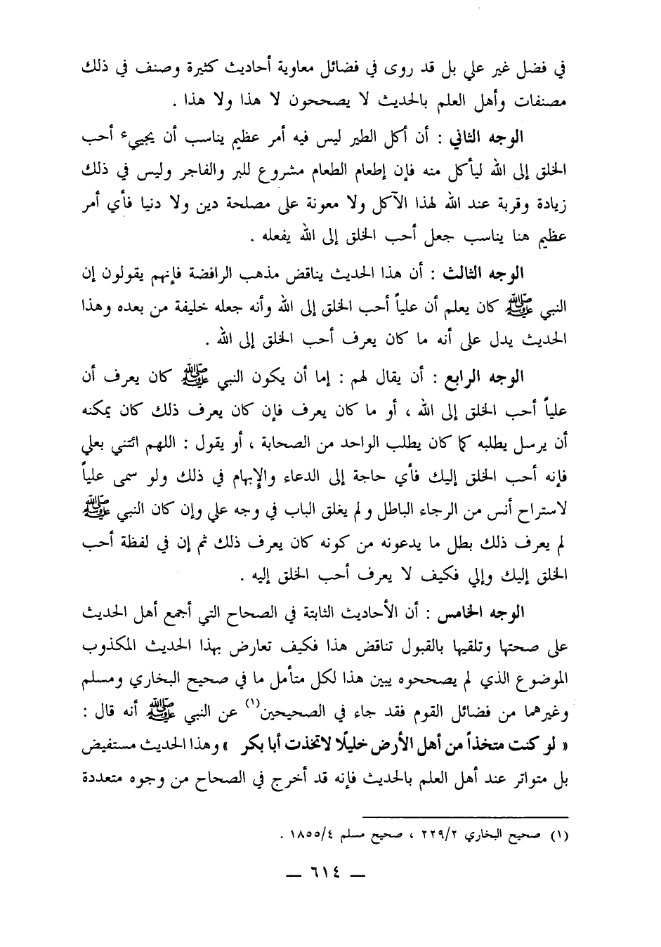 الوجه الرابع أن يقال لهم إما أن يكون النبي صلى الله عليه وسلم كان يعرف أن علياً أحب الخلق إلى الله أو ما كان يعرف، فإن كان يعرف ذلك كان يمكنه أن يرسل يطلبه كما كان يطلب الواحد من الصحابة أو يقول: اللهم ائتني بعلي فإنه أحب الخلق إليك فأي حاجة إلى الدعاء والإبهام في ذلك ولو سمي علي لاستراح أنس من الرجاء الباطل ولم يغلق الباب في وجه علي وإن كان النبي صلى الله عليه وسلم لم يعرف ذلك بطل ما يدعونه من كونه كان يعرف ذلك ثم إن في لفظه أحب الخلق إليك وإليّ فكيف لا يعرف أحب الخلق إليه.