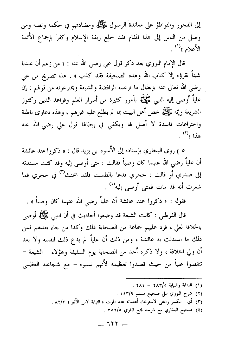 قال الإمام النووي بعد ذكر قول علي رضي الله عنه: "من زعم أن عندنا شيئاً نقرؤه إلا كتاب الله وهذه الصحيفة فقد كذب هذا تصريح من علي رضي الله عنه بإبطال ما تزعمه الرافضة والشيعة ويخترعونه من قولهم إن علياً أوصى إليه النبي بأمور كثيرة من أسرار العلم وقواعد الدين وكنوز الشريعة وإنه صلى الله عليه وسلم خص أهل البيت بما لم يطلع عليهم غيرهم، وهذه دعاوى باطلة واختراعات فاسدة لا أصل لها ويكفي في إبطالها قول علي رضي الله عنه هذا"2.