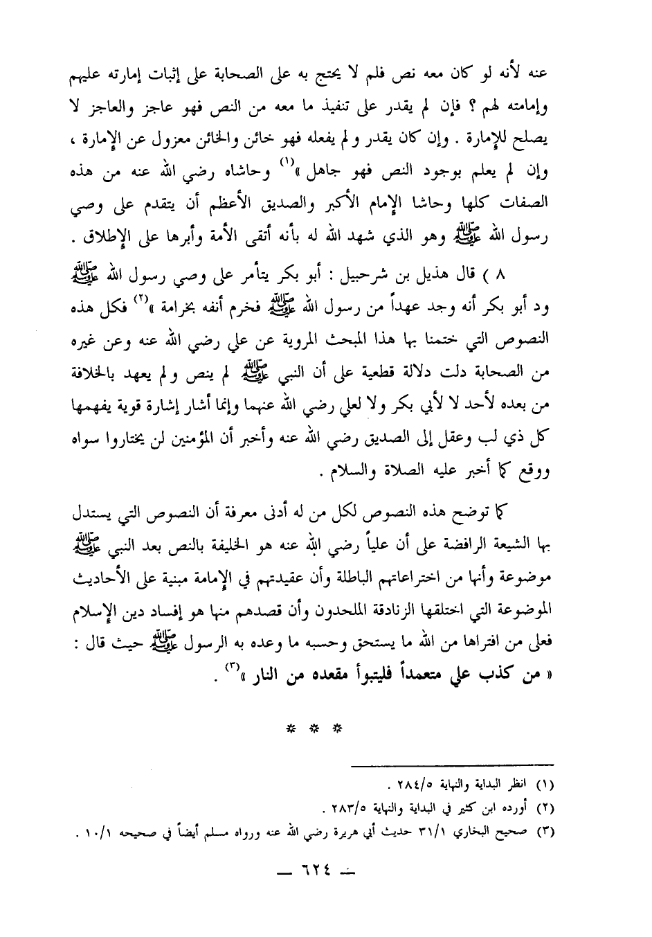 كما توضح هذه النصوص لكل من له أدنى معرفة أن النصوص التي يستدل بها الشيعة الرافضة على أن علياً رضي الله عنه هو الخليفة بالنص بعد النبي صلى الله عليه وسلم موضوعة وأنها من اختراعاتهم الباطلبة وأن عقيدتهم في الإمامة مبنية على الأحاديث الموضوعة التي اختلقها الزنادقة الملحدون وأن قصدهم منها هو إفساد دين الإسلام فعلى من افتراها من الله ما يستحق وحسبه ما وعده به الرسول صلى الله عليه وسلم حيث قال: "من كذب علي متعمداً فليتبوأ مقعده من النار" 3.
