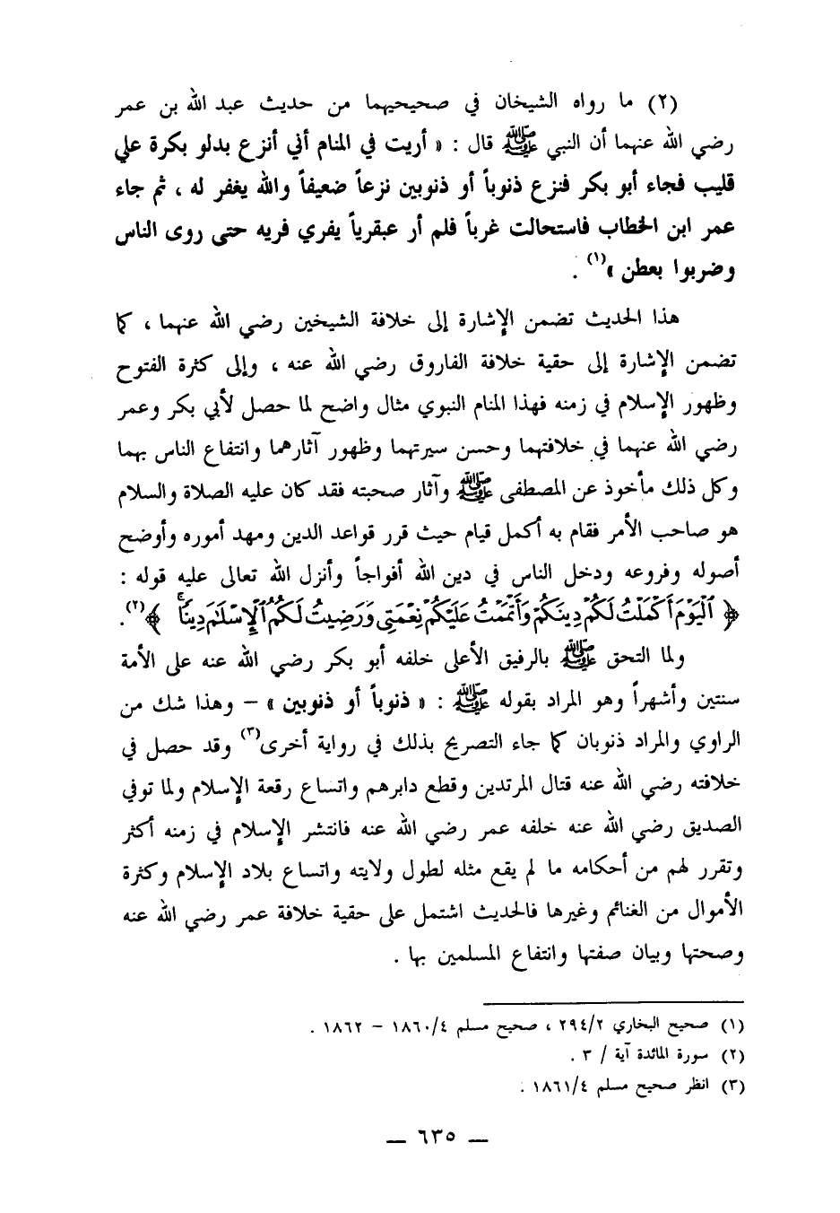 هذا الحديث تضمن الإشارة إلى خلافة الشيخين رضي الله عنهما، كما تضمن الإشارة إلى حقية خلافة الفاروق رضي الله عنه، وإلى كثرة الفتوح وظهور الإسلام في زمنه فهذا المنام النبوي مثال واضح لما حصل لأبي بكر وعمر رضي الله عنهما في خلافتهما وحسن سيرتهما وظهور آثارهما وانتفاع الناس بهما وكل ذلك مأخوذ عن المصطفى صلى الله عليه وسلم وآثار صحبته فقد كان عليه الصلاة والسلام هو صاحب الأمر فقام به أكمل قيام حيث قرر قواعد الدين ومهد أموره وأوضح أصوله وفروعه ودخل الناس في دين الله أفواجاً وأنزل الله تعالى عليه قوله: {الْيَوْمَ أَكْمَلْتُ لَكُمْ دِينَكُمْ وَأَتْمَمْتُ عَلَيْكُمْ نِعْمَتِي وَرَضِيتُ لَكُمُ الْأِسْلامَ دِيناً} 2.