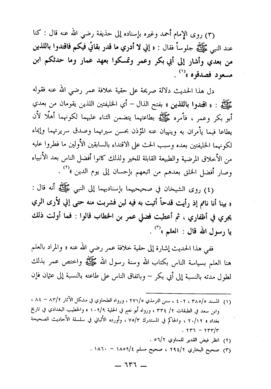 دل هذا الحديث دلالة صريحة على حقية خلافة عمر رضي الله عنه فقوله صلى الله عليه وسلم: "اقتدوا باللذين" بفتح الذال ـ أي الخليفتين اللذين يقومان من بعدي أبو بكر وعمر، فأمره صلى الله عليه وسلم بطاعتهما يتضمن الثناء عليهما لكونهما أهلاً لأن يطاعا فيما يأمران به وينهيان عنه المؤذن بحسن سيرتهما وصدق سريرتهما وإيماء لكونهما الخليفتين بعده وسبب الحث على الاقتداء بالسابقين الأولين ما فطروا عليه من الأخلاق المرضية والطبيعة القابلة للخير ولذلك كانوا أفضل الناس بعد الأنبياء وصار أفضل الخلق بعدهم من اتبعهم بإحسان إلى يوم الدين"2.