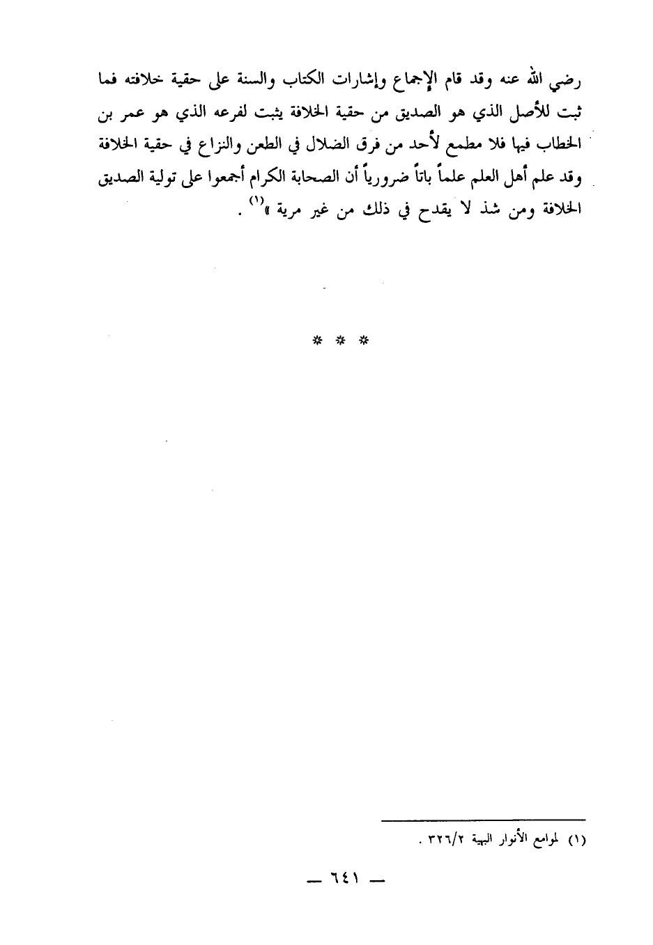 رضي الله عنه وقد قام الإجماع وإشارات الكتاب والسنة على حقية خلافته فما ثبت للأصل الذي هو الصديق من حقية الخلافة يثبت لفرعه الذي هو عمر بن الخطاب فيها فلا مطمع لأحد من فرق الضلال في الطعن والنزاع في حقية الخلافة وقد علم أهل العلم علماً باتاً ضرورياً أن الصحابة الكرام أجمعوا على تولية الصديق الخلافة ومن شذ لا يقدح في ذلك من غير مرية"1.