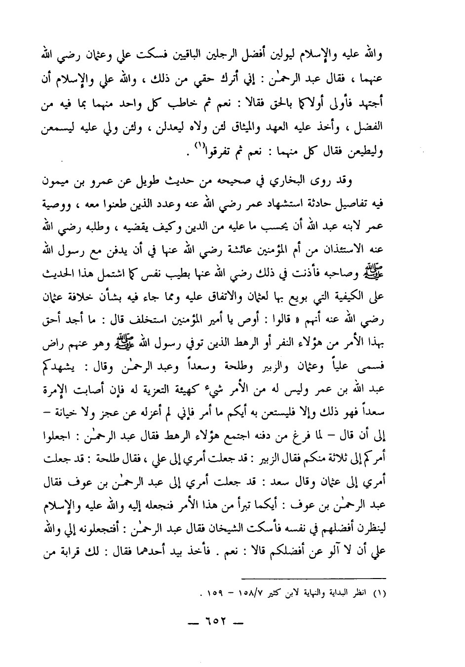 والله عليه والإسلام ليولين أفضل الرجلين الباقيين فسكت علي وعثمان رضي الله عنهما، فقال عبد الرحمن: إني أترك حقي من ذلك، والله علي والإسلام أن أجتهد فأولي أولاكما بالحق فقالا: نعم ثم خاطب كل واحد منهما بما فيه من الفضل، وأخذ عليه العهد والميثاق لئن ولاه ليعدلن، ولئن ولي عليه ليسمعن وليطيعن فقال كل واحد منهما: نعم ثم تفرقوا1.