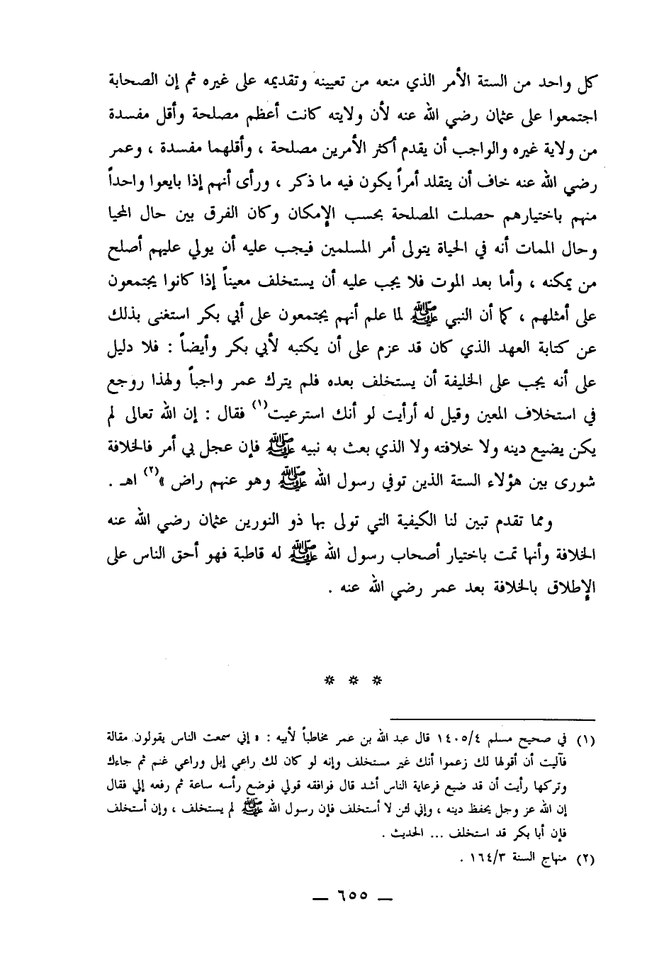 1ـ في صحيح مسلم 4/1405 قال عبد الله بن عمر مخاطباً لأبيه: "إني سمعت الناس يقولون مقالة فآليت أن أقولها لك زعموا أنك غير متسخلف وإنه لو كان لك راعي إبل وراعي غنم ثم جاءك وتركها رأيت أن قد ضيع فرعاية الناس أشد قال فوافقه قولي فوضع رأسه ساعة ثم رفعه إلي فقال إن الله عز وجل يحفظ دينه، وإني لئن لا أستخلف فإن رسول الله صلى الله عليه وسلم لم يستخلف، وإن أستخلف فإن أبا بكر قد استخلف.. الحديث.