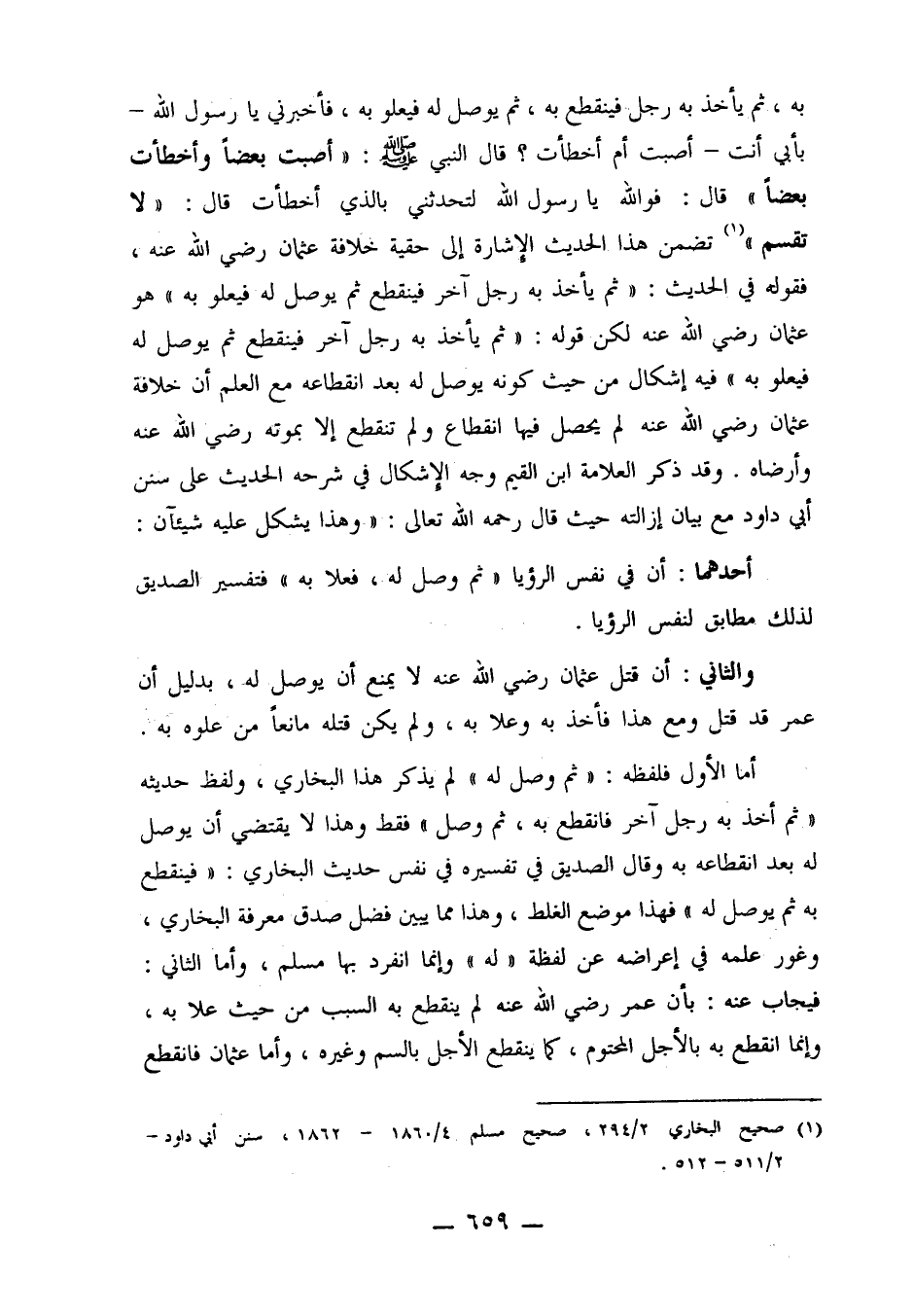 أما الأول: فلفظه: "ثم وصل له" لم يذكر هذا البخاري، ولفظ حديثه " ثم أخذ به رجل آخر فانقطع به، ثم وصل" فقط وهذا لا يقتضي أن يوصل له بعد انقطاعه به وقال الصديق في تفسيره في نفس حديث البخاري: "فينقطع به ثم يوصل له" فهذا موضع الغلط، وهذا مما يبين فضل صدق معرفة البخاري، وغور علمه في إعراضه عن لفظة "له" وإنما انفرد بها مسلم، وأما الثاني: فيجاب عنه: بأن عمر رضي الله عنه لم ينقطع به السبب من حيث علا به، وإنما انقطع به بالأجل المحتوم، كما ينقطع الأجل بالسم وغيره، وأما عثمان فانقطع