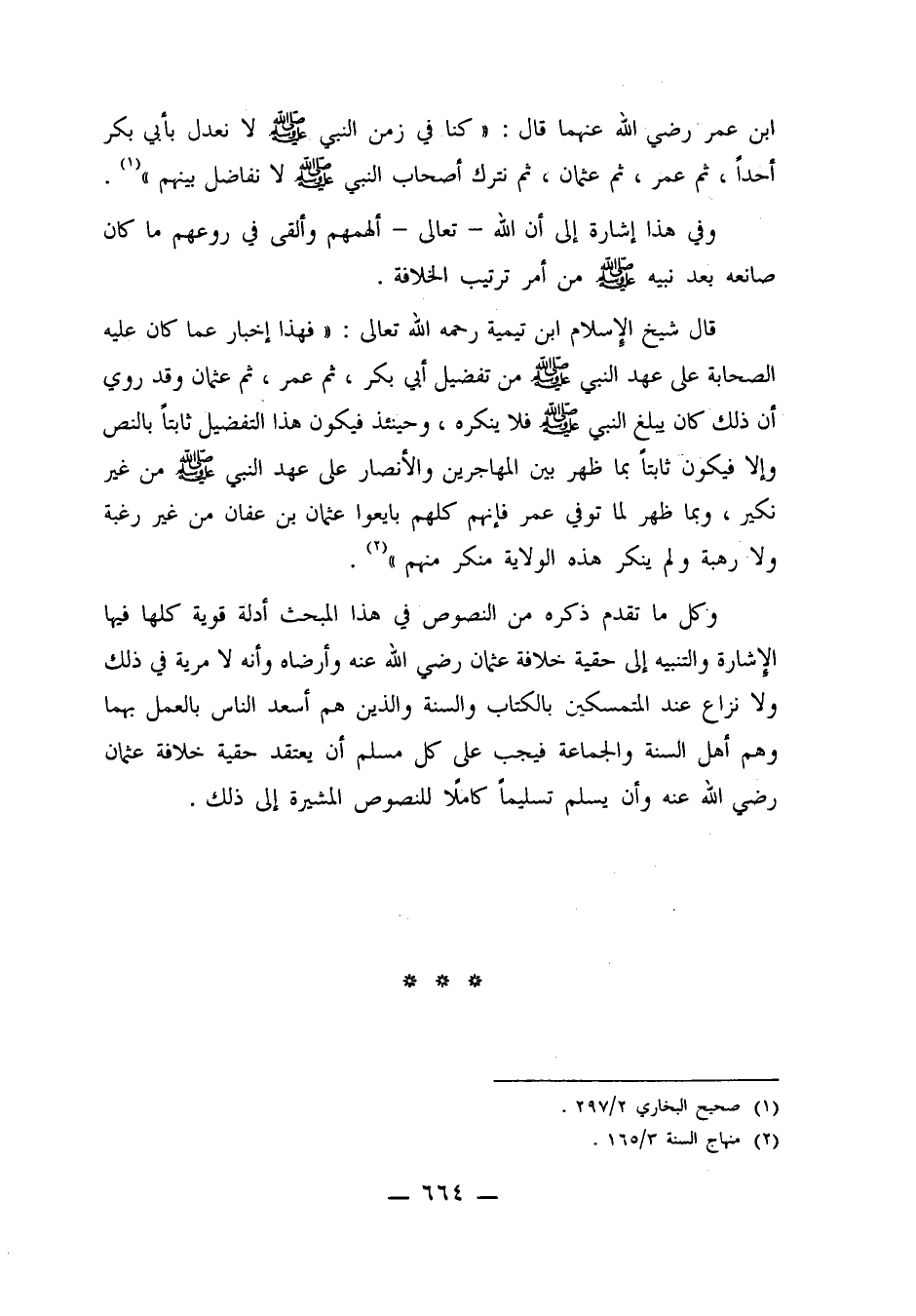قال شيخ الإسلام ابن تيمية رحمه الله تعالى: "فهذا إخبار عما كان عليه الصحابة على عهد النبي صلى الله عليه وسلم من تفضيل أبي بكر، ثم عمر، ثم عثمان وقد روي أن ذلك كان يبلغ النبي صلى الله عليه وسلم فلا ينكره، وحينئذ فيكون هذا التفضيل ثابتاً بالنص وإلا فيكون ثابتاً بما ظهر بين المهاجرين والأنصار على عهد النبي صلى الله عليه وسلم من غير نكير، وبما ظهر لما توفي عمر فإنهم كلهم بايعوا عثمان بن عفان من غير رغبة ولا رهبة ولم ينكر هذه الولاية منكر منهم"2.