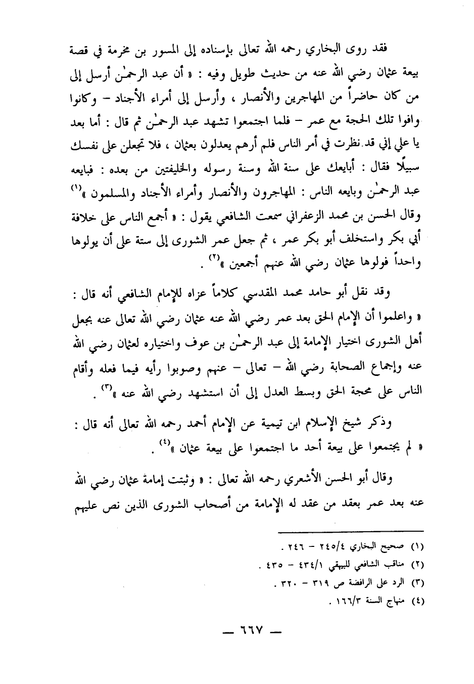 وقد نقل أبو حامد محمد المقدسي كلاماً عزاه للإمام الشافعي أنه قال: "واعلموا أن الإمام الحق بعد عمر رضي الله عنه عثمان رضي الله تعالى عنه بجعل أهل الشورى اختيار الإمامة إلى عبد الرحمن بن عوف واختياره لعثمان رضي الله عنه وإجماع الصحابة رضي الله تعالى عنهم وصوبوا رأيه فيما فعله وأقام الناس على محجة الحق وبسط العدل إلى أن استشهد رضي الله عنه"3.