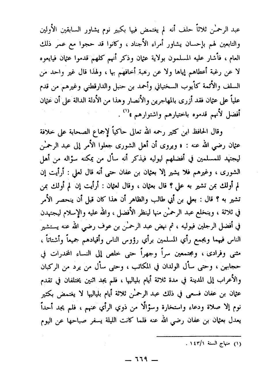 عبد الرحمن ثلاثاً حلف أنه لم يغتمض فيها بكبير نوم يشاور السابقين الأولين والتابعين لهم بإحسان يشاور أمراء الأجناد، وكانوا قد حجوا مع عمر ذلك العام، فأشار عليه المسلمون بولاية عثمان وذكر أنهم كلهم قدموا عثمان فبايعوه لا عن رغبة أعطاهم إياها ولا عن رهبة أخافهم بها، ولهذا قال غير واحد من السلف والأئمة كأيوب السختياني وأحمد بن حنبل والدارقطني وغيرهم من قدم علياً على عثمان فقد أزرى بالمهاجرين والأنصار وهذا من الأدلة الدالة على أن عثمان أفضل لأنهم قدموه باختيارهم واشتوارهم"1.