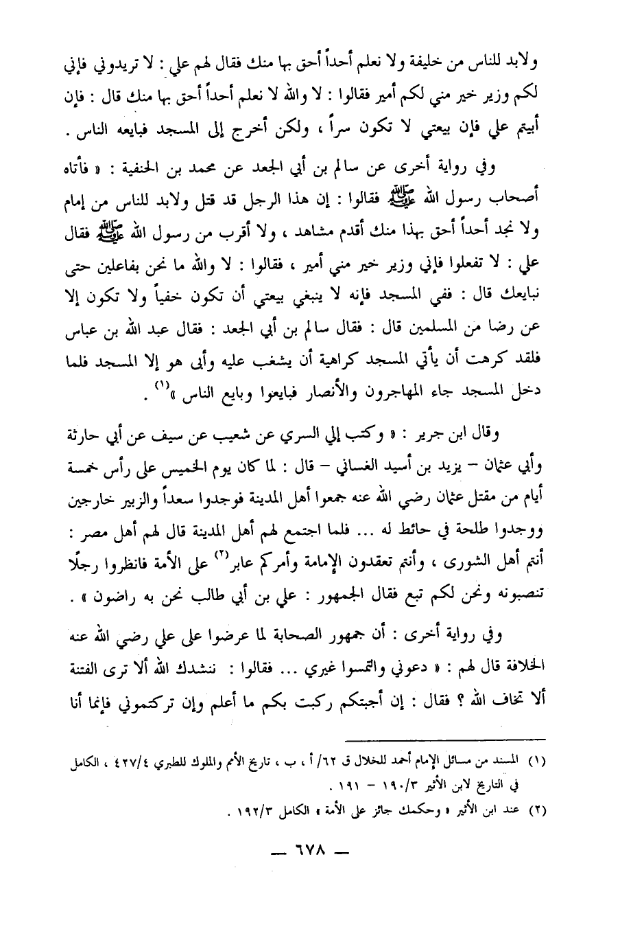 وقال ابن جرير: "وكتب إلى السري عن شعيب عن سيف عن أبي حارثة وأبي عثمان ـ يزيد بن أسيد الغساني ـ قال: لما كان يوم الخميس على رأس خمسة أيام من مقتل عثمان رضي الله عنه جمعوا أهل المدينة فوجدوا سعداً والزبير خارجين ووجدوا طلحة في حائط له ... فلما اجتمع لهم أهل المدينة قال لهم أهل مصر: أنتم أهل الشورى، وأنتم تعقدون الإمامة وأمركم عابر2 على الأمة فانظروا رجلاً تنصبونه ونحن لكم تبع فقال الجمهور: علي بن أبي طالب نحن به راضون".