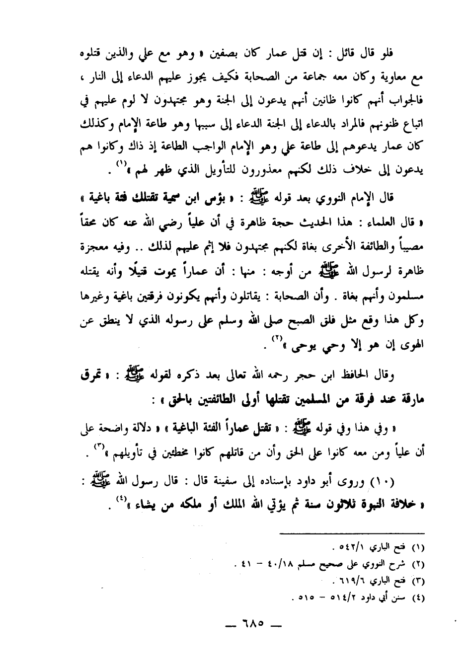 وقال الحافظ ابن حجر رحمه الله تعالى بعد ذكره لقوله صلى الله عليه وسلم: "تمرق مارقة عند فرقة من المسلمين تقتلها أولى الطائفتين بالحق": "وفي هذا وفي قوله صلى الله عليه وسلم: "تقتل عماراً الفئة الباغية" "دلالة واضحة على أن علياً ومن معه كانوا على الحق وأن من قاتلهم كانوا مخطئين في تأويلهم"3.