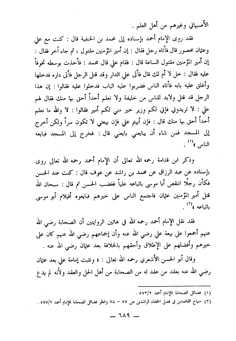 2ـ منهاج القاصدين في فضل الخلفاء الراشدين ص/77-78 وانظر فضائل الصحابة للإمام أحمد 2/577.