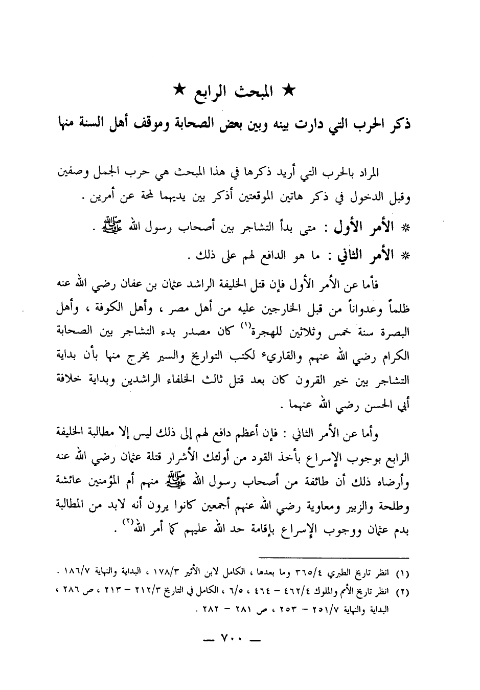 وأما عن الأمر الثاني: فإن أعظم دافع لهم إلى ذلك ليس إلا مطالبة الخليفة الرابع بوجوب الإسراع بأخذ القود من أولئك الأشرار قتلة عثمان رضي الله عنه وأرضاه ذلك أن طائفة من أصحاب رسول الله صلى الله عليه وسلم منهم أم المؤمنين عائشة وطلحة والزبير ومعاوية رضي الله عنهم أجمعين كانوا يرون أنه لا بد من المطالبة بدم عثمان ووجوب الإسراع بإقامة حد الله عليهم كما أمر الله2.