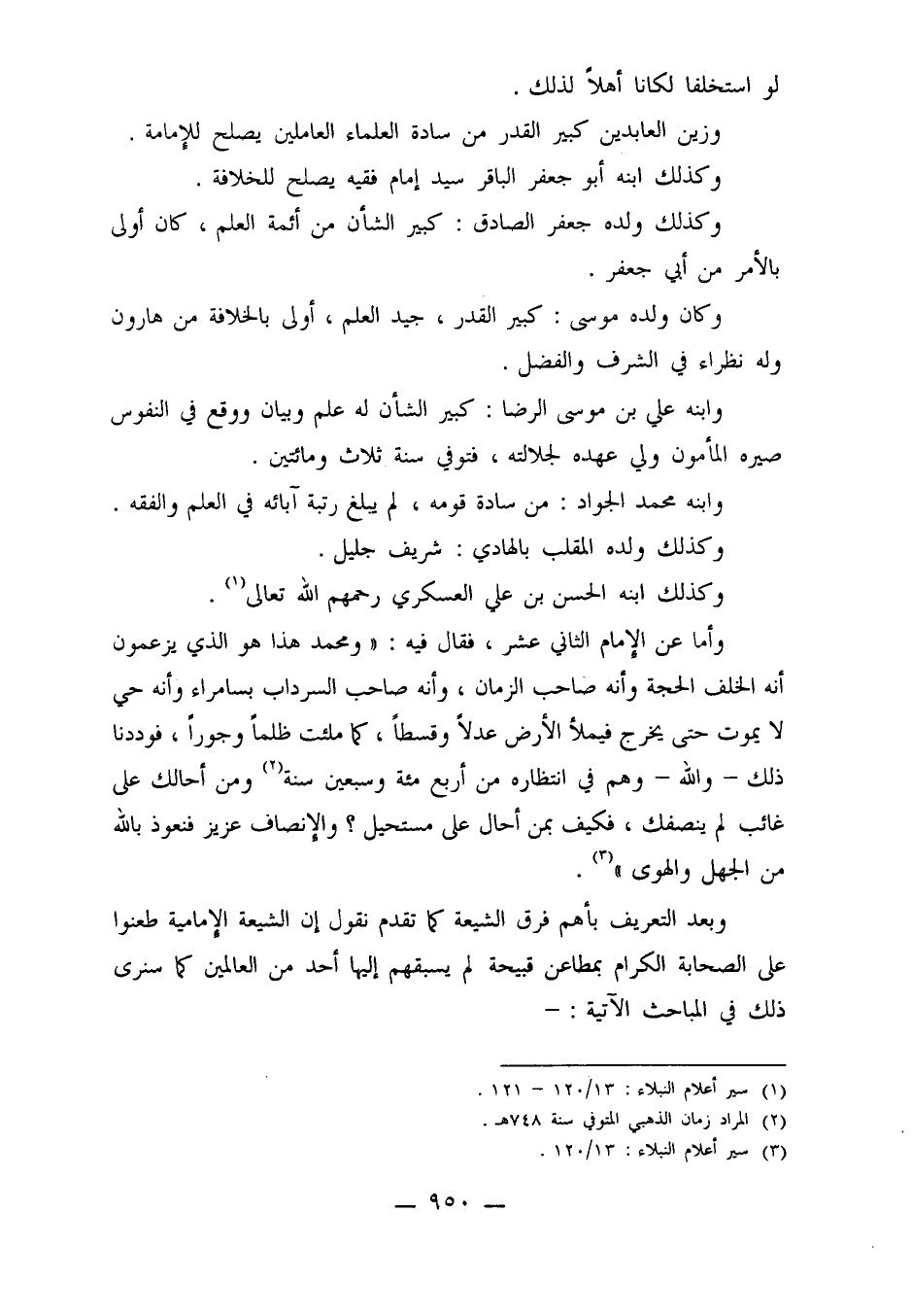 وأما عن الإمام الثاني عشر، فقال فيه: "ومحمد هذا هو الذي يزعمون أنه الخلف الحجة وأنه صاحب الزمان، وأنه صاحب الزمان، وأنه صاحب السرداب بسامراء وأنه حي لا يموت حتى يخرج فيملأ الأرض عدلاً وقسطاً، كما ملئت ظلماً وجوراً، فوددنا ذلك ـ والله ـ وهم في انتظاره من أربع مئة وسبعين سنة 2 ومن أحالك على غائب لم ينصفك، فكيف بمن أحال على مستحيل؟ والإنصاف عزيز فنعوذ بالله من الجهل والهوى" 3.