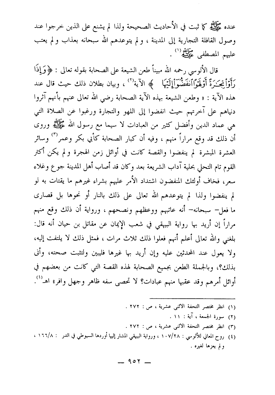 قال الألوسي رحمه الله مبيناً طعن الشيعة على الصحابة بقوله تعالى: {وَإِذَا رَأَوْا تِجَارَةً أَوْ لَهْواً انْفَضُّوا إِلَيْهَا} الآية2، وبيان بطلان ذلك حيث قال عند هذه الآية: "وطعن الشيعة بهذه الآية الصحابة رضي الله تعالى عنهم بأنهم آثروا دنياهم على آخرتهم حيث انفضوا إلى اللهو والتجارة ورغبوا عن الصلاة التي هي عماد الدين وأفضل كثير من العبادات لا سيما مع رسول الله صلى الله عليه وسلم وروى أن ذلك قد وقع مراراً منهم، وفيه أن كبار الصحابة كأبي بكر وعمر3 وسائر العشرة المبشرة لم ينفضوا والقصة كانت في أوائل زمن الهجرة ولم يكن أكثر القوم تام التحلي بحلية آداب الشريعة بعد وكان قد أصاب أهل المدينة جوع وغلاء سعر، فخاف أولئك المنفضون اشتداد الأمر عليهم بشراء غيرهم ما يقتات به لو لم ينفضوا ولذا لم يتوعدهم الله تعالى على ذلك بالنار أو نحوها بل قصارى ما فعل ـ سبحانه ـ أنه عاتبهم ووعظهم ونصحهم، ورواية أن ذلك وقع منهم مراراً إن أريد بها رواية البيهقي في شعب الإيمان عن مقاتل بن حيان أنه قال: بلغني والله تعالى أعلم أنهم فعلوا ثلاث مرات، فمثل ذلك لا يلتفت إليه، ولا يعول عند المحدثين عليه، وإن أريد بها غيرها فليبين ولتثبت صحته، وأنى بذلك؟، وبالجملة الطعن بجميع الصحابة لهذه القصة التي كانت من بعضهم في أوائل أمرهم وقد عقبها منهم عبادات؟ لا تحصى سفه ظاهر وجهل وافر"أهـ4.