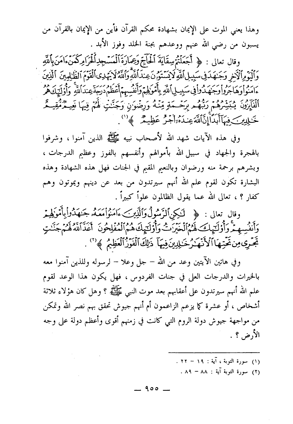 وفي هاتين الآيتين وعد من الله ـ جل وعلا ـ لرسوله وللذين آمنوا معه بالخيرات والدرجات العلى في جنات الفردوس، فهل يكون هذا الوعد لقوم علم الله أنهم سيرتدون على أعقابهم بعد موت النبي صلى الله عليه وسلم؟ وهل كان هؤلاء ثلاثة أشخاص، أو عشرة كما يزعم الزاعمون أم أنهم جيوش تحقق بهم نصر الله وتمكن من مواجهة جيوش دولة الروم التي كانت في زمنهم أقوى وأعظم دولة على وجه الأرض؟.