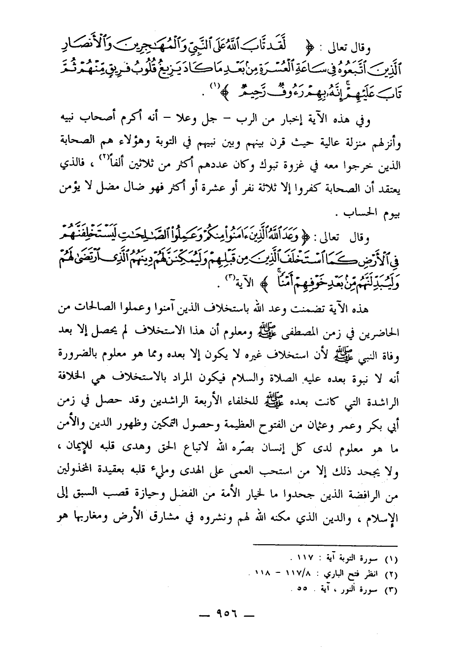وفي هذه الآية إخبار من الرب ـ جل وعلا ـ أنه أكرم أصحاب نبيه وأنزلهم منزلة عالية حيث قرن بينهم وبين نبيهم في التوبة وهؤلاء هم الصحابة الذين خرجوا معه في غزوة تبوك وكان عددهم أكثر من ثلاثين ألفاً2، فالذي يعتقد أن الصحابة كفروا إلا ثلاثة نفر أو عشرة أو أكثر فهو ضال مضل لا يؤمن بيوم الحساب.