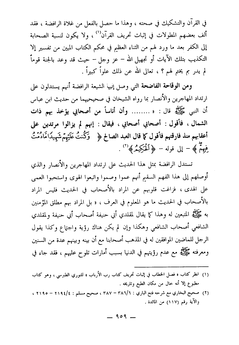 ومن الوقاحة الفاضحة التي وصل إليها الشيعة الرافضة أنهم يستدلون على ارتداد المهاجرين والأنصار بما رواه الشيخان في صحيحيهما من حديث ابن عباس أن النبي صلى الله عليه وسلم قال: ".... وأن أناساً من أصحابي يؤخذ بهم ذات الشمال، فأقول: أصحابي أصحابي، فيقال: إنهم لم يزالوا مرتدين على أعقابهم منذ فارقتهم فأقول كما قال العبد الصالح {وَكُنْتُ عَلَيْهِمْ شَهِيداً مَا دُمْتُ فِيهِمْ} ـ إلى قوله ـ {الحكيم} 2.