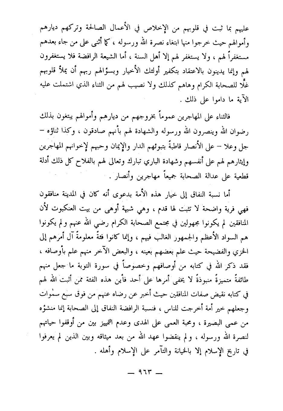 عليهم بما ثبت في قلوبهم من الإخلاص في الأعمال الصالحة وتركهم ديارهم وأموالهم حيث خرجوا منها ابتغاء نصرة الله ورسوله، كما أثنى على من جاء بعدهم مستغفراً لهم، ولا يستغفر لهم إلا أهل السنة، أما الشيعة الرافضة فلا يستغفرون لهم وإنما يدينون بالاعتقاد بتكفير أولئك الأخيار وبسؤالهم ربهم أن يملأ قلوبهم غلاً للصحابة الكرام وهاهم كذلك ولا نصيب لهم من الثناء الذي اشتملت عليه الآية ما داموا على ذلك.